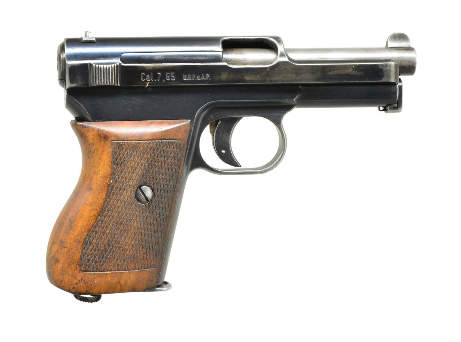 PROPERTY MARKED 1ST VARIATION SEMI AUTO PISTOL WITH HOLSTER. Cal. 7.65mm. S# 557069. Bbl. 3 1/2”. Engraved WWII German eagle “M” on left frame panel. Front grip strap is marked w/ the Nordseeflotte (North Sea Fleet) property number “N/4614”. Matching numbers. High polish hot salt blue finish w/ Mauser banner to the left of Kreigsmarine marking. Crown “U” proofed behind rear sight. Checkered 1 piece wraparound walnut grips. 1 Of only about 8,000 of this variation procured by the German Navy. MAGS: 1-8 rd. Mauser banner mag. UNATTACHED ACCESSORIES: brown Akah pebble grain holster. CONDITION: slide & frame have thinning metal finish on high edges as well as larger areas of finish loss from holster & grip wear on sides of slide & front strap. Bbl. Has traces of blue in protected areas. Good bore that shows a ringed bulge approx. half way through bore. Not visible from exterior & does not impede mechanical function. Good holster shows wear w/ scuffs & decent Akah marking. (20-3197/ZAL). CURIO. $1,000-1,500.