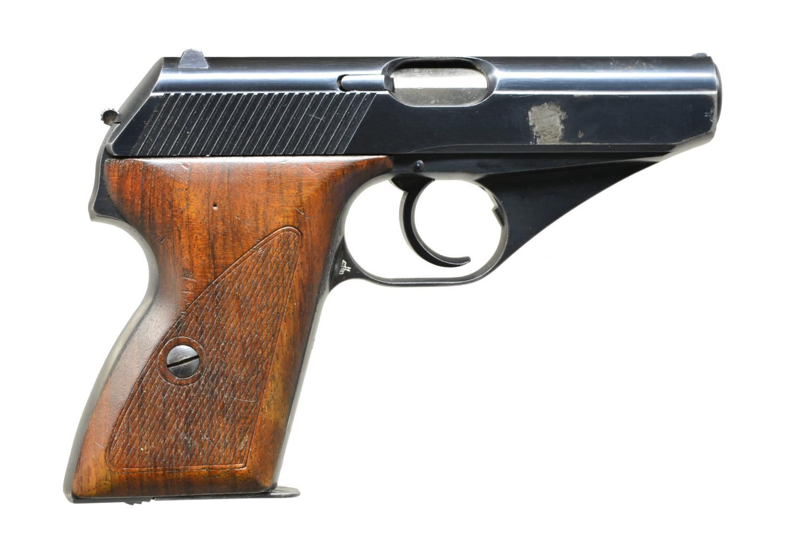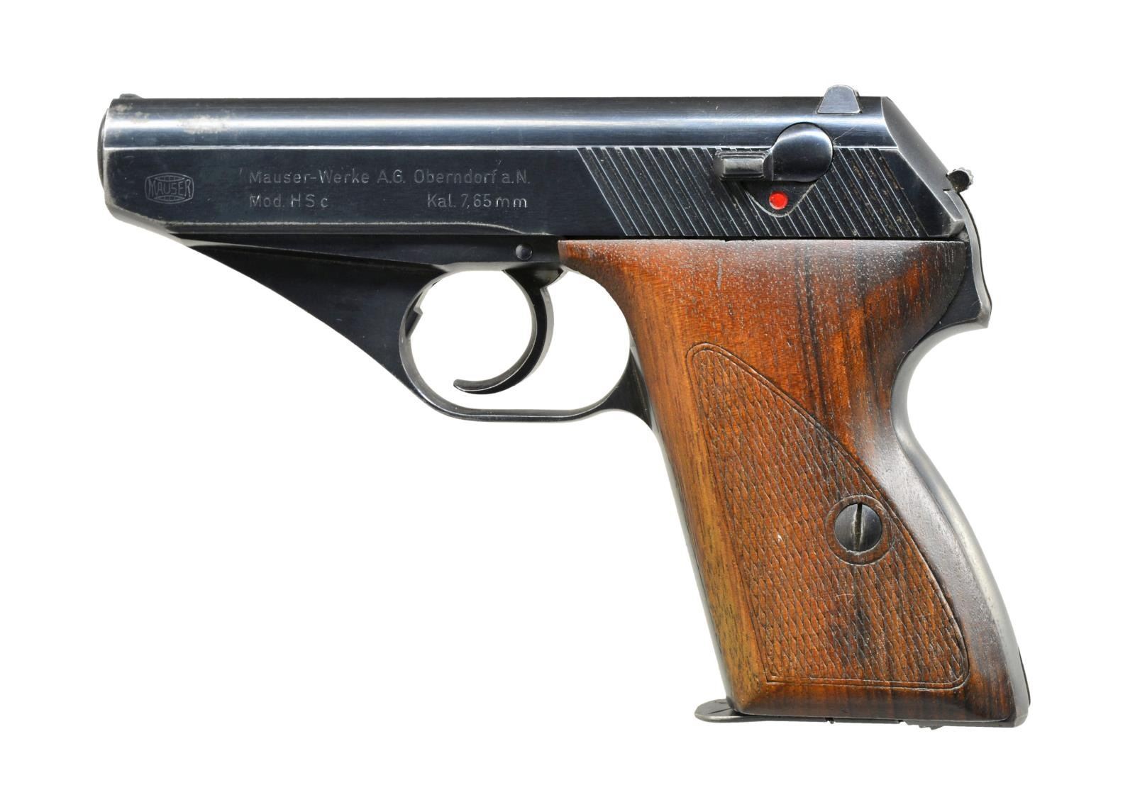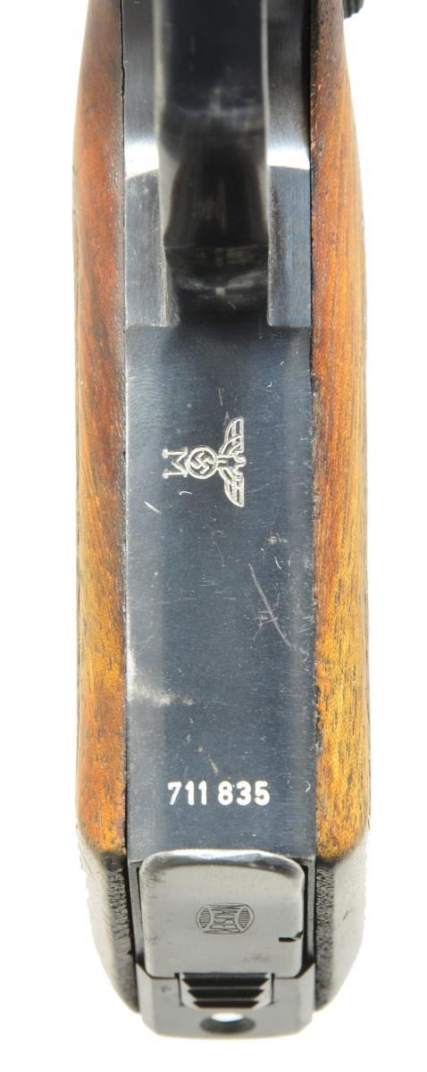 PISTOL. Cal. 7.65mm. S# 711835. Bbl. 3 1/4”. These scarce eagle “M” HScs were mostly issued to U-boat personnel. Inscribed w/ a very recognizable eagle “M” on front grip strap. These iconic sm. arms are extremely desirable to both German sm. arms & Kreigsmarine collectors. Crown “N” proofs on bbl., frame & slide. Matching numbers. Checkered walnut grips. Frame has provision for lanyard loop. MAGS: 1-7 rd. Mauser banner based mag. CONDITION: overall nice appearance w/ some mild muzzle & high edge wear. Slide has a few larger spots of faded finish w/ scattered light handling marks. Crisp markings. Very good grips w/ some scattered dings & minor scratches. Very good bright bore w/ lightly worn rifling. (20-3195/ZAL). CURIO. $1,500-2,000.