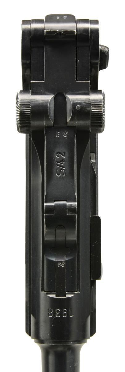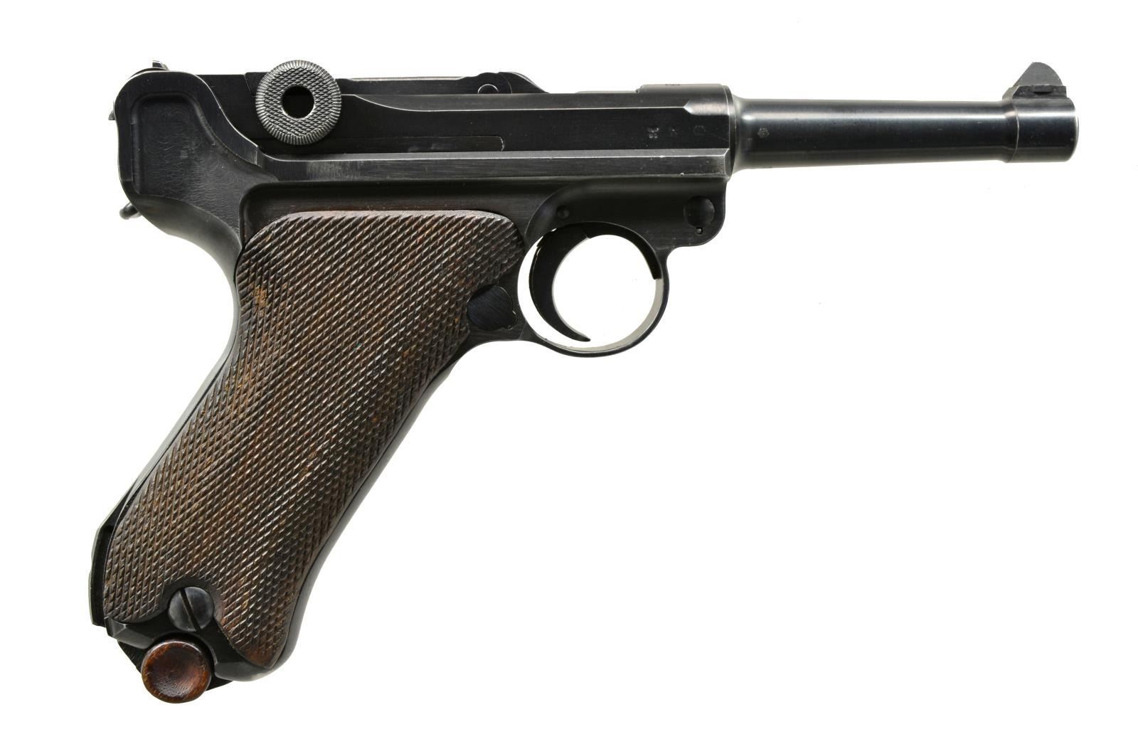 Cal. 9mm Luger. S# 289d. Bbl. 4". All matching numbers including rear toggle pivot & grips. Mfg. for military sales w/ all blue finish. Eagle 83 proofs. MAGS: 1 good tin plated 8 rd. w/ wood base having lg. chip at top of left side plus split behind knobs; crown proof at spine. UNATTACHED ACCESSORIES: good brown oiled holster w/ buckle & strap retention. Back marked "epf / 1941" plus eagle WaA 185 & "P.08". Includes black painted repro. combo tool stamped "DMW". CONDITION: very good general appearance w/ some high point wear likely from holstering. Occasional sm. spot of peppery oxidation. Especially well fitted grips in very good condition w/ some light hand wear to diamond tops. Very good bore w/ faint hint of frosting in corners of grooves. (20-1832/NW). CURIO. $1,000-1,500.