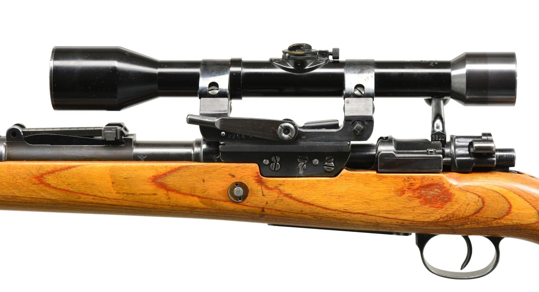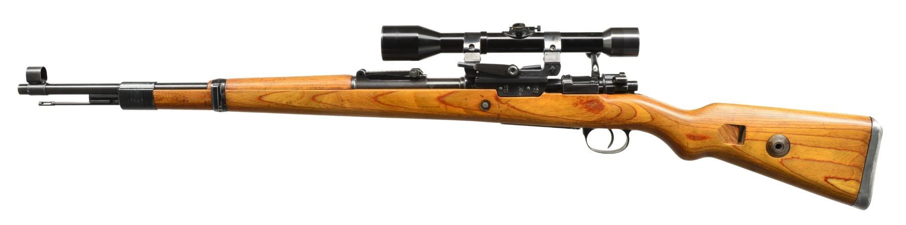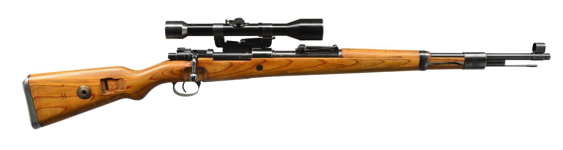 Cal. 8mm Mauser. S# 3620i. Bbl. 23 5/8". Mauser byf 42 Action 98K rifle w/ German long rail Sniper scope & mt. Non-milled left receiver rail tapped to accommodate long rail Snipe mt. through standard receiver rail markings. An attractive 98K rifle designed to replicate World War II long rail sniper rifle. Rifle has very nice original finish on wood & metal w/ all matching numbers & crisp markings. Rifle features tangent rear sight graduated to 2,000m. Inverted V front sight w/ protective hood. Receiver ring marked on top "eagle 135 / byf / 42", marked on left side w/ eagle proof. Cleaning rod & bayonet bar are present. All milled furniture including solid upper band. Laminated hardwood stock set w/ cup type buttplate & steel takedown hole. Buttstock marked w/ eagle "WaA135" at belly, under grip & on right side of butt. Sling slot marked on inside "RR", "3" & 2 script "p". Long rail scope base attached to receiver by 3 screws w/ locking screws & 2 tapered steel pins. Mt. has sheet metal bands & windage adj. using special key. 6x Scope is marked "CARL ZEISS / JENA ZIELSECHS / No 77033". Scope has 3 post German reticle. Scope mt. has serial number "2256v" & eagle "359". UNATTACHED ACCESSORIES: brown leather scope caps. CONDITION: stock set has very light wear & scattered handling marks. Metal retains 95% original blue w/ light high point wear & scattered very sm. scratches. Near excellent shiny bore. (20-898/RW). CURIO. $4,000-6,000.
