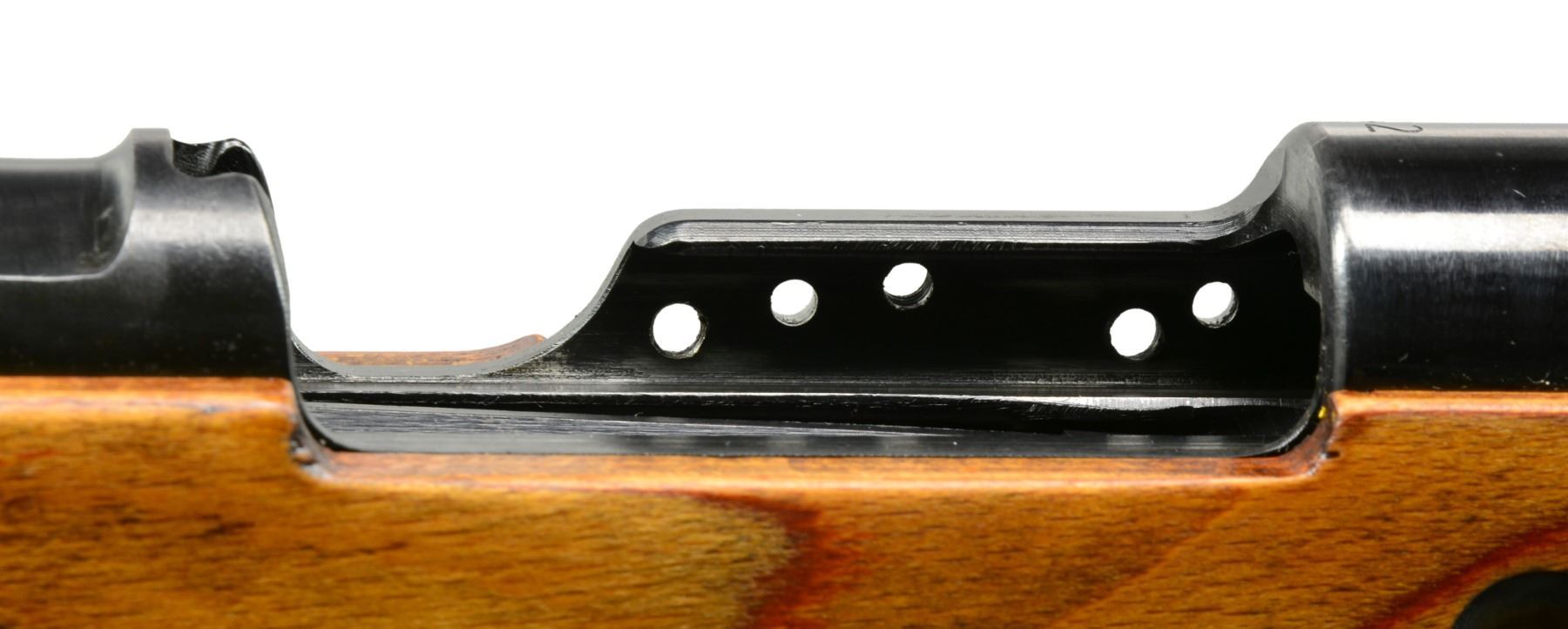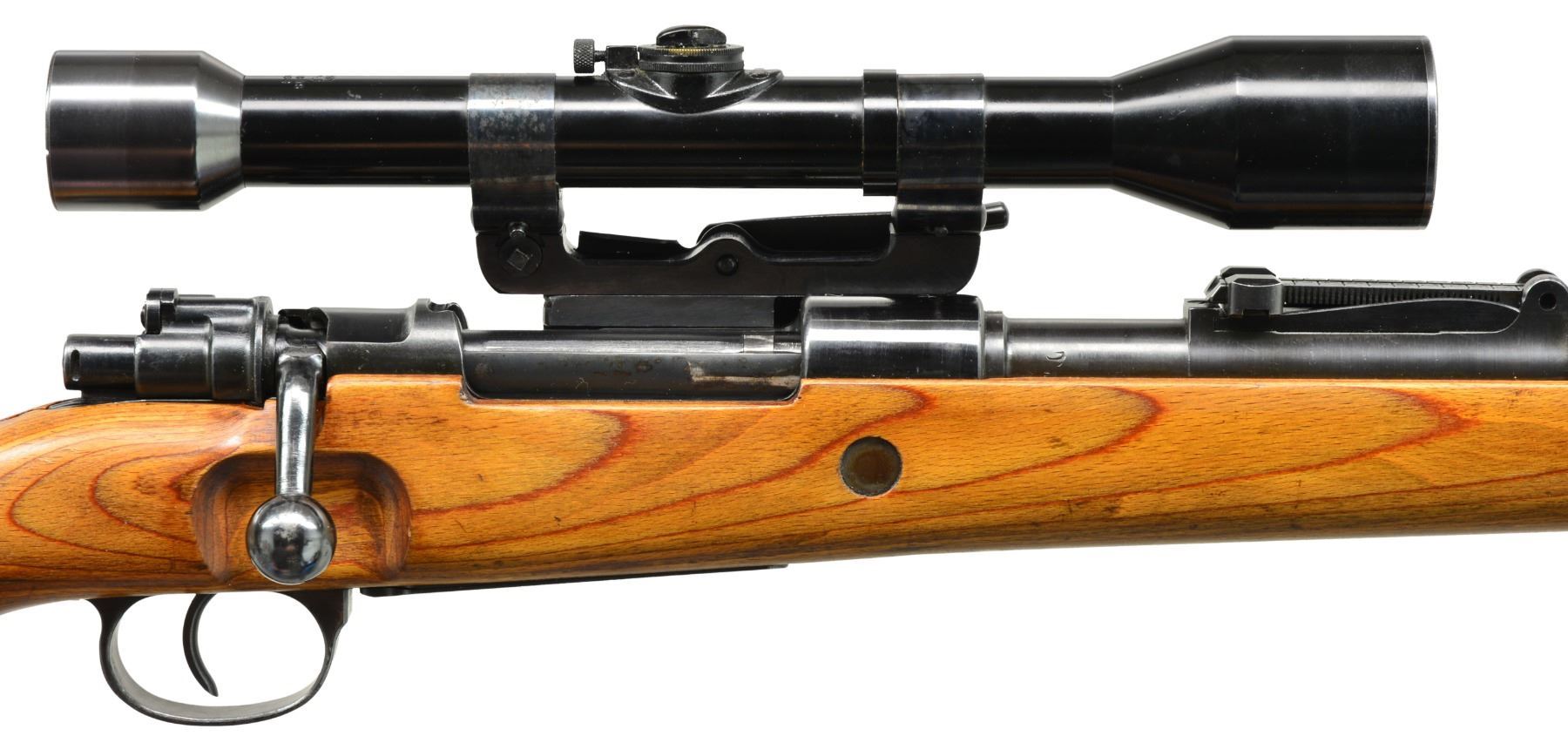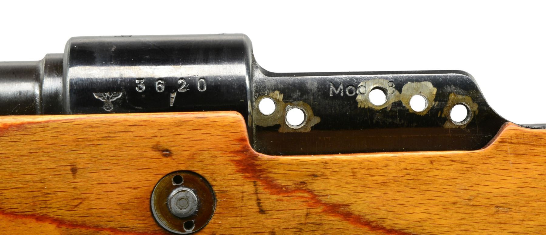 Cal. 8mm Mauser. S# 3620i. Bbl. 23 5/8". Mauser byf 42 Action 98K rifle w/ German long rail Sniper scope & mt. Non-milled left receiver rail tapped to accommodate long rail Snipe mt. through standard receiver rail markings. An attractive 98K rifle designed to replicate World War II long rail sniper rifle. Rifle has very nice original finish on wood & metal w/ all matching numbers & crisp markings. Rifle features tangent rear sight graduated to 2,000m. Inverted V front sight w/ protective hood. Receiver ring marked on top "eagle 135 / byf / 42", marked on left side w/ eagle proof. Cleaning rod & bayonet bar are present. All milled furniture including solid upper band. Laminated hardwood stock set w/ cup type buttplate & steel takedown hole. Buttstock marked w/ eagle "WaA135" at belly, under grip & on right side of butt. Sling slot marked on inside "RR", "3" & 2 script "p". Long rail scope base attached to receiver by 3 screws w/ locking screws & 2 tapered steel pins. Mt. has sheet metal bands & windage adj. using special key. 6x Scope is marked "CARL ZEISS / JENA ZIELSECHS / No 77033". Scope has 3 post German reticle. Scope mt. has serial number "2256v" & eagle "359". UNATTACHED ACCESSORIES: brown leather scope caps. CONDITION: stock set has very light wear & scattered handling marks. Metal retains 95% original blue w/ light high point wear & scattered very sm. scratches. Near excellent shiny bore. (20-898/RW). CURIO. $4,000-6,000.
