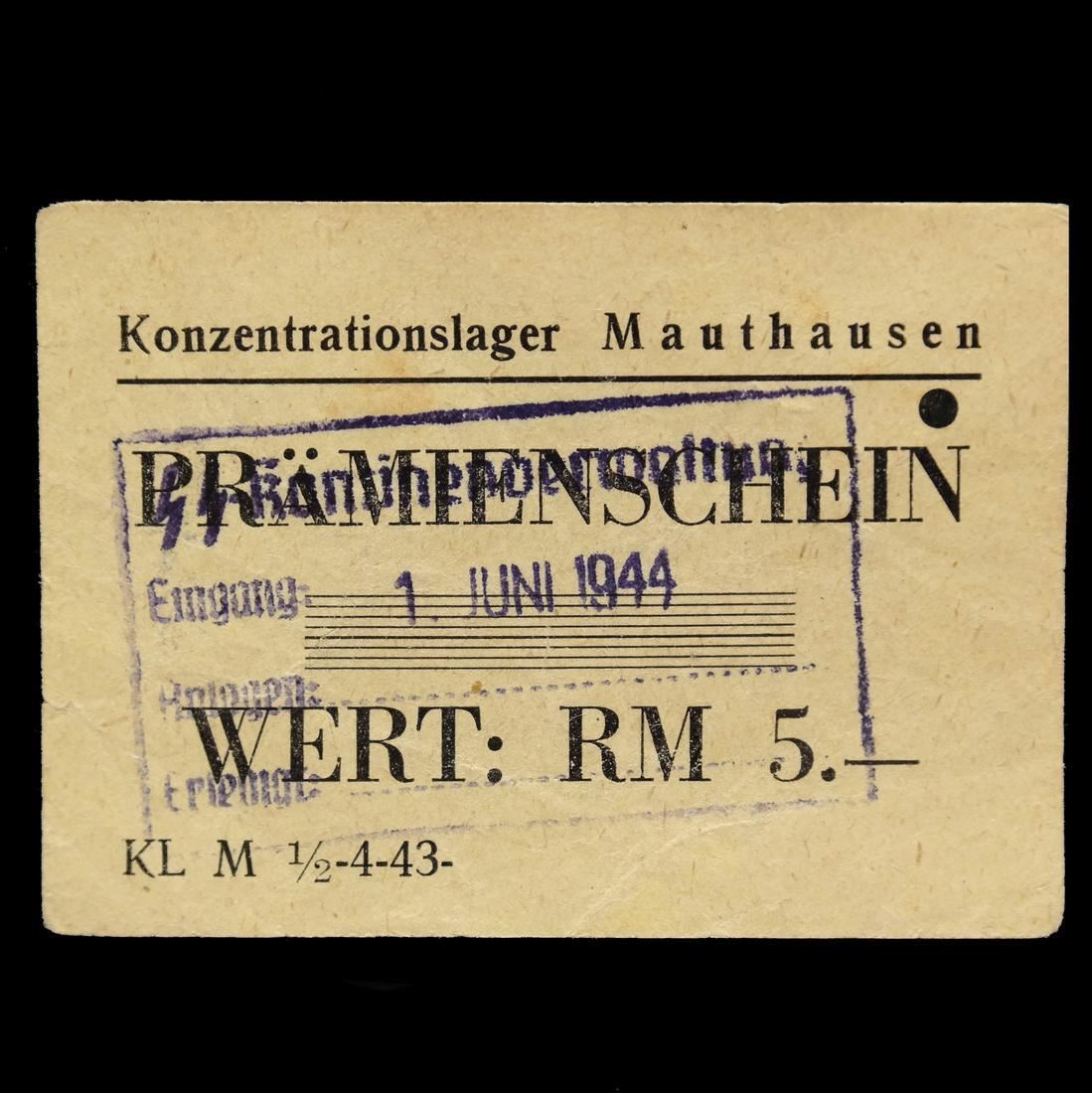 Konzentrationslager Mauthausen / Prmienschein / Wert: RM 5.- on yellow paper, violet SS-Kantinenverwaltung handstamp dated 1 Juni 1944, measures approx 75 by 54mm, light wrinkles, small edge tear and one minuscule pinhole, F-VF.