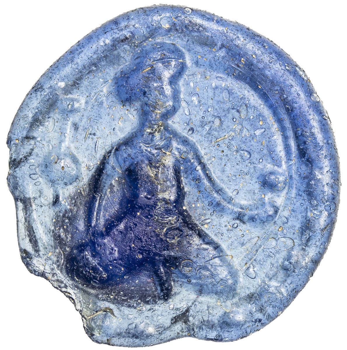 MEDIEVAL ISLAMIC EGYPT AND SYRIA: glass vessel stamp (5.94g), roughly 29mm, translucent blue, seated female figures, legs crossed, holding what appears to be a glass of wine, with uncertain image to left; without any legends or symbols, uniface, VF-EF, RR.