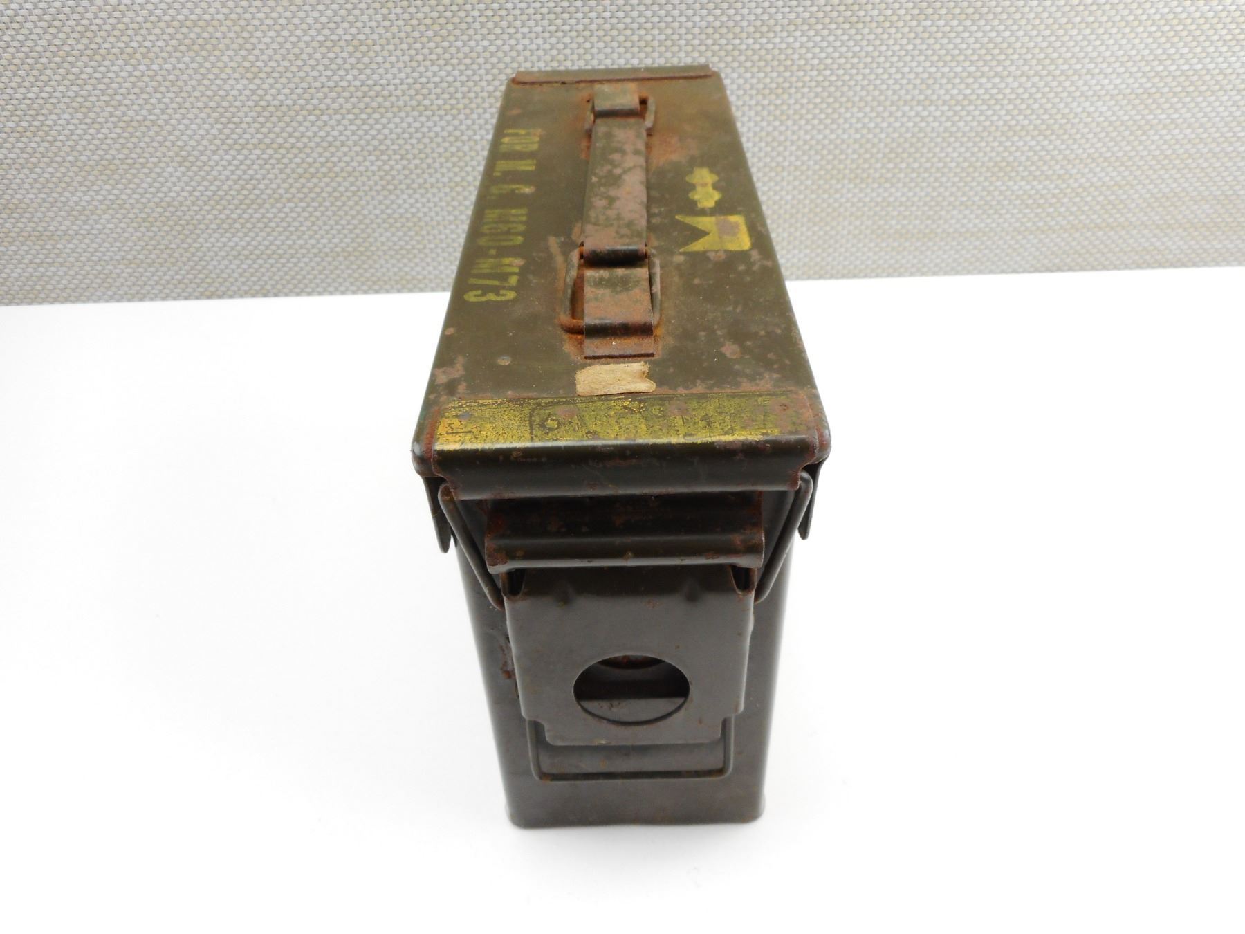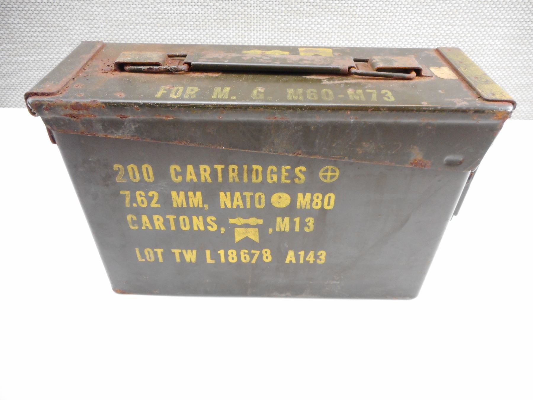METAL AMMO TIN , METAL AMMO TIN, STAMPED 7.62MM NATO M80 LOT TW L18678 A143, APPROX. SIZE 11" X 4" X 7"