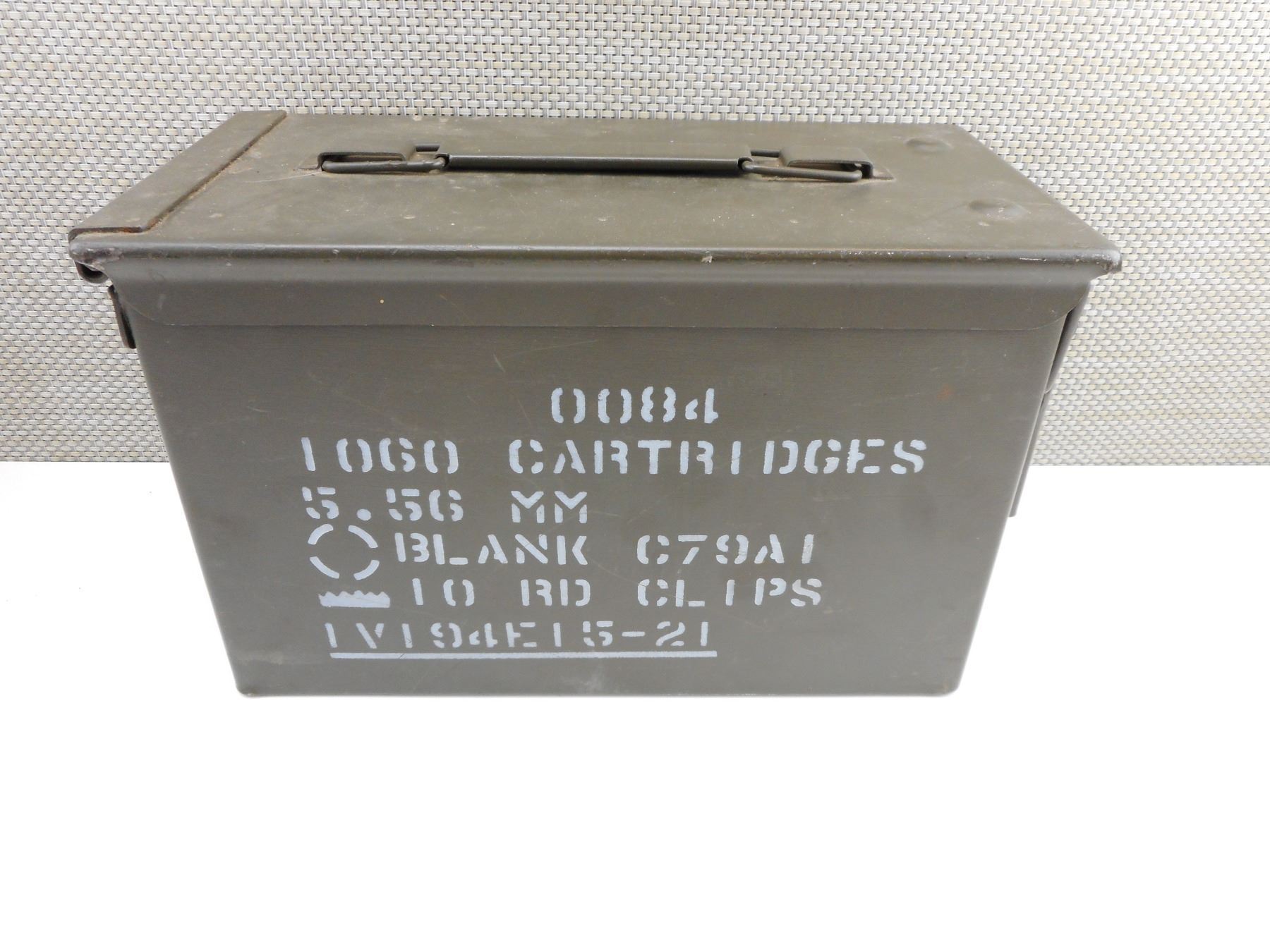 METAL AMMO TIN , METAL AMMO TIN, STAMPED 1060 CARTRIDGES 5.56MM BLANK 10 RD CLIPS IVI94E15-21, APPROX. SIZE 12" X 6.5" X 7"