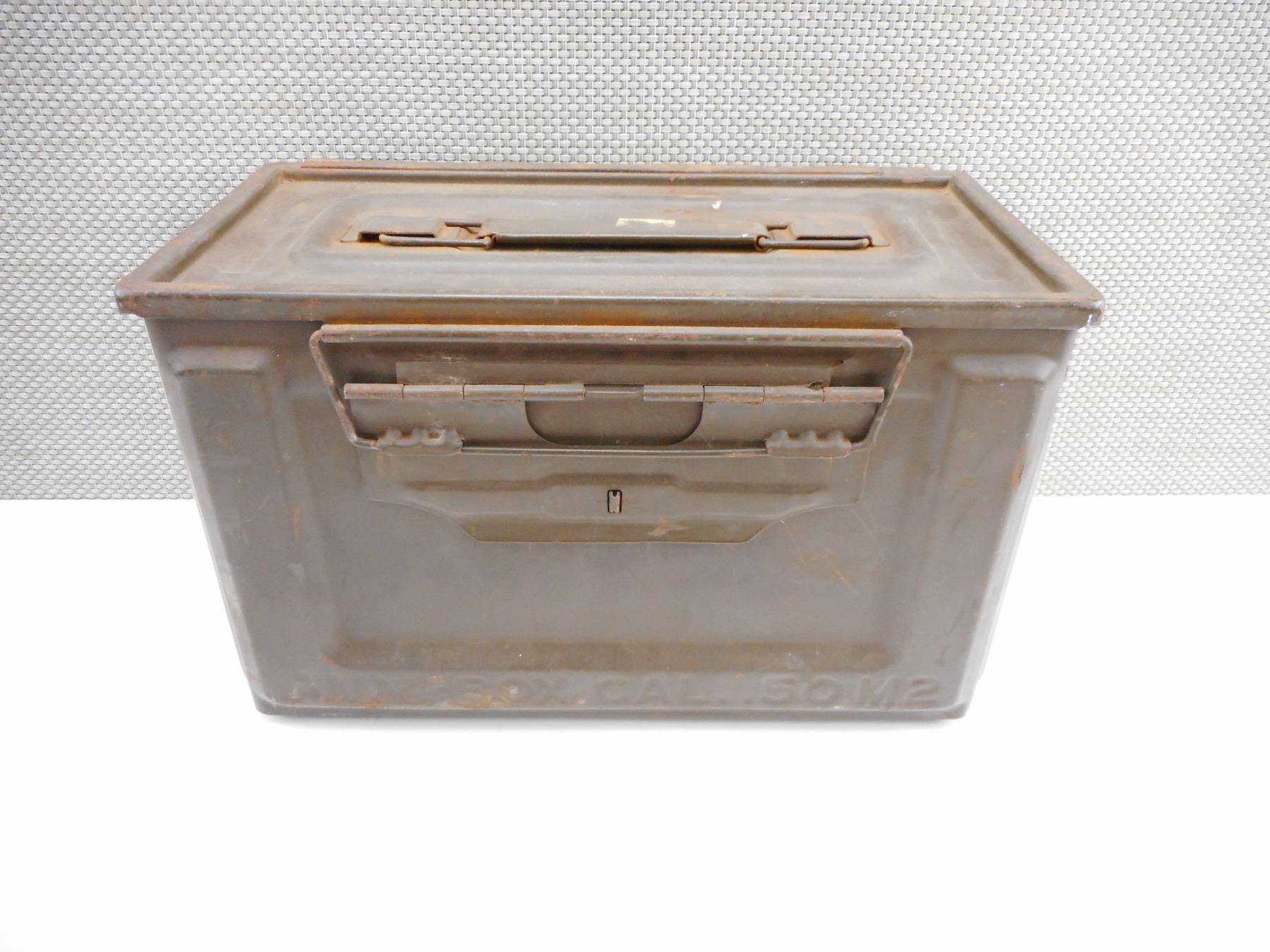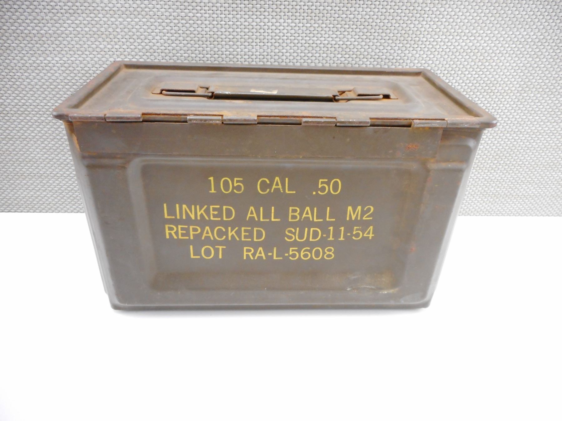 METAL AMMO TIN , APPROX. SIZE 12" X 6" X 8", STAMPED 105 CAL .50, LINKED ALL BALL M2, REPACKED SUD-11-54, LOT RA-L-5608