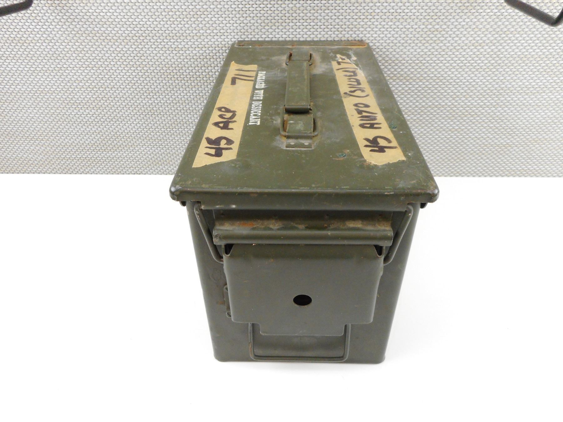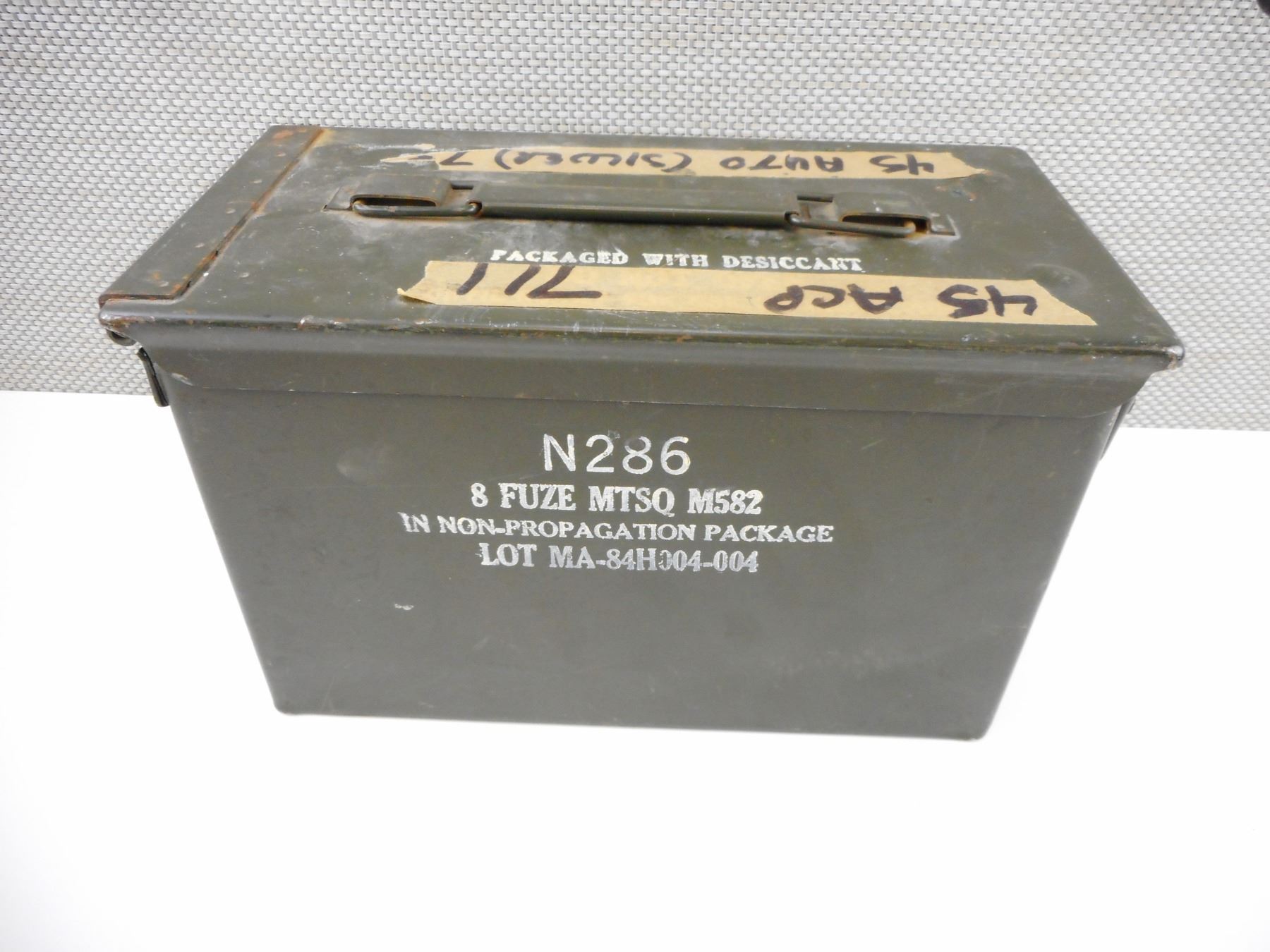 METAL AMMO TIN , APPROX SIZE 12" X 6" X 7" - STAMPED N286, 8 FUZE MTSQ. M582, IN NON-PROPAGATION PACKAGE, LOT MA-84H004-004