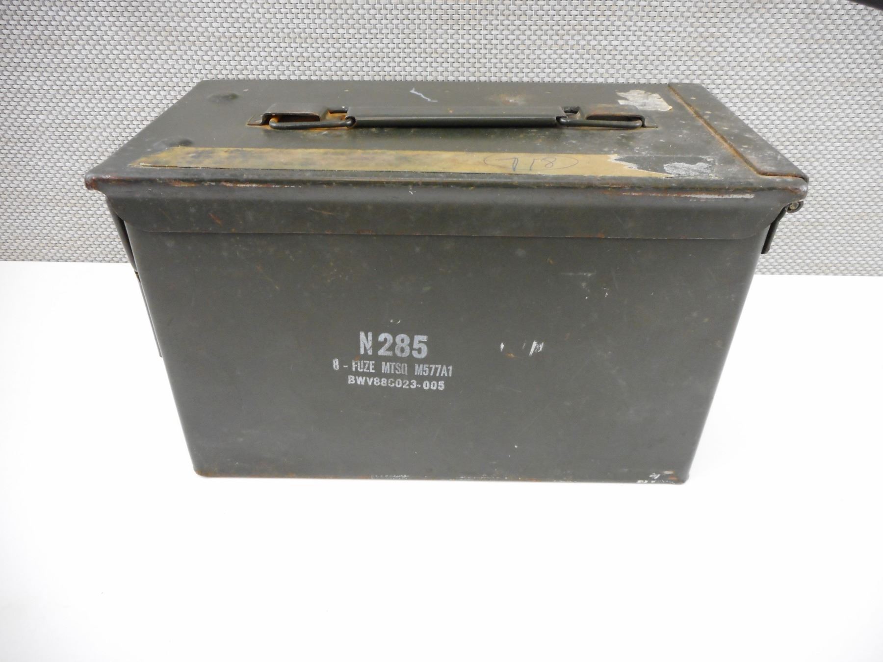 METAL AMMO TIN , APPROX SIZE 12" X 6" X 7" , STAMPED N285, 8 - FUZE MTSQ. M577A1, BWV88C023-005