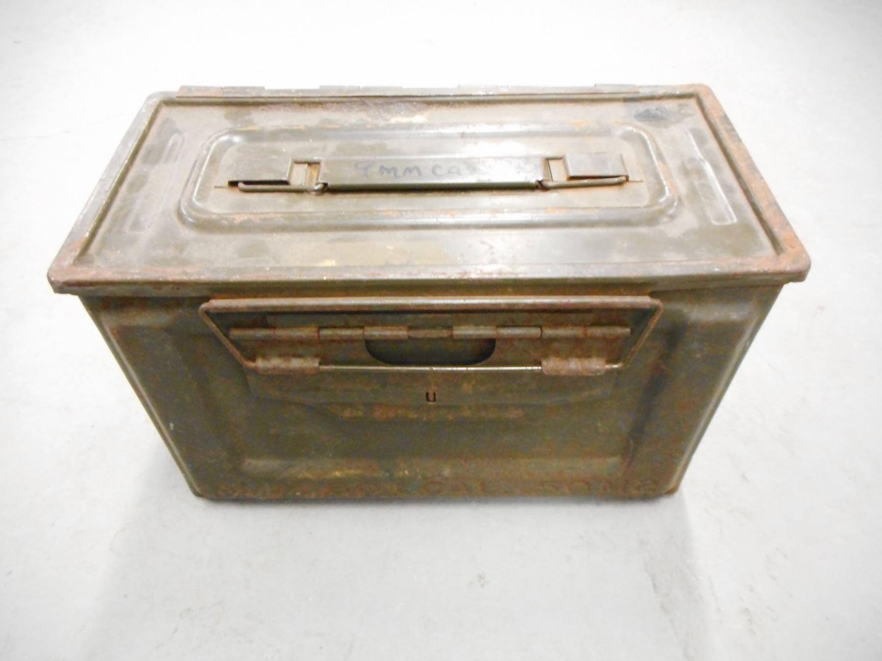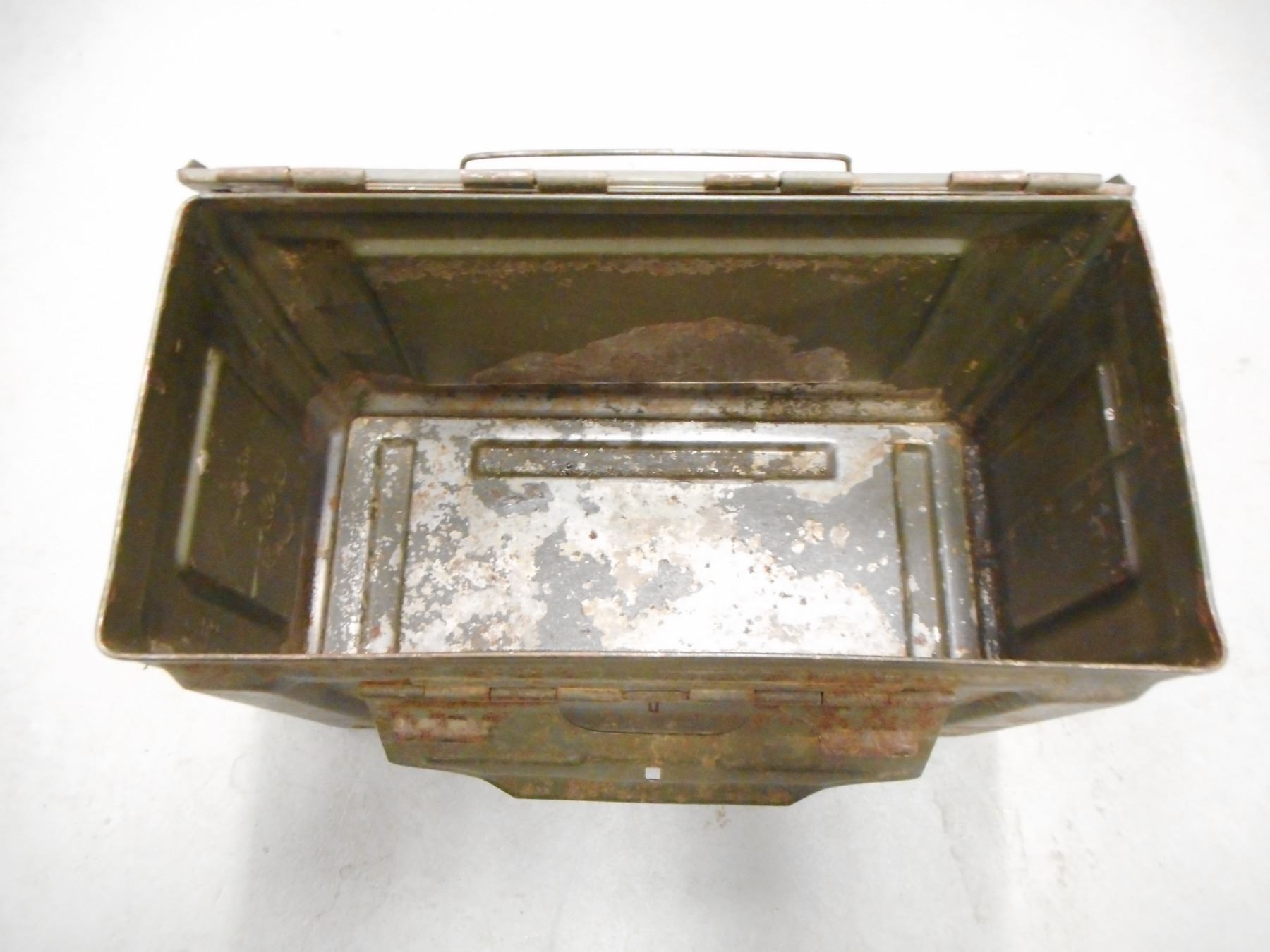 METAL AMMO TIN , APPROX SIZE 12" X 6.5" X 8, STAMPED A557, 108 CARTRIDGES, CAL .50 4 BALL M2, LINKED, LOT L95-ML/C-69