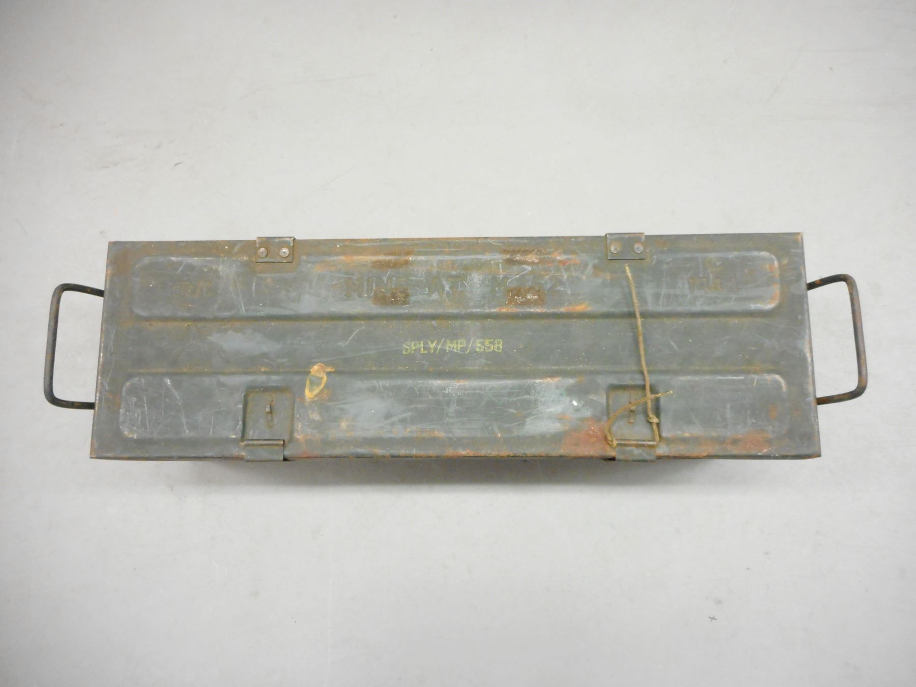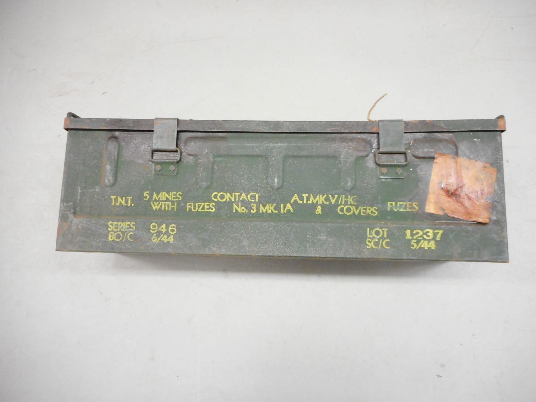 METAL MILITARY TIN , APPROX. SIZE 28.5" X 9" X 9", STAMPED 1944, T.N.T., 5 MINES WITH FUZES, NO3 MK