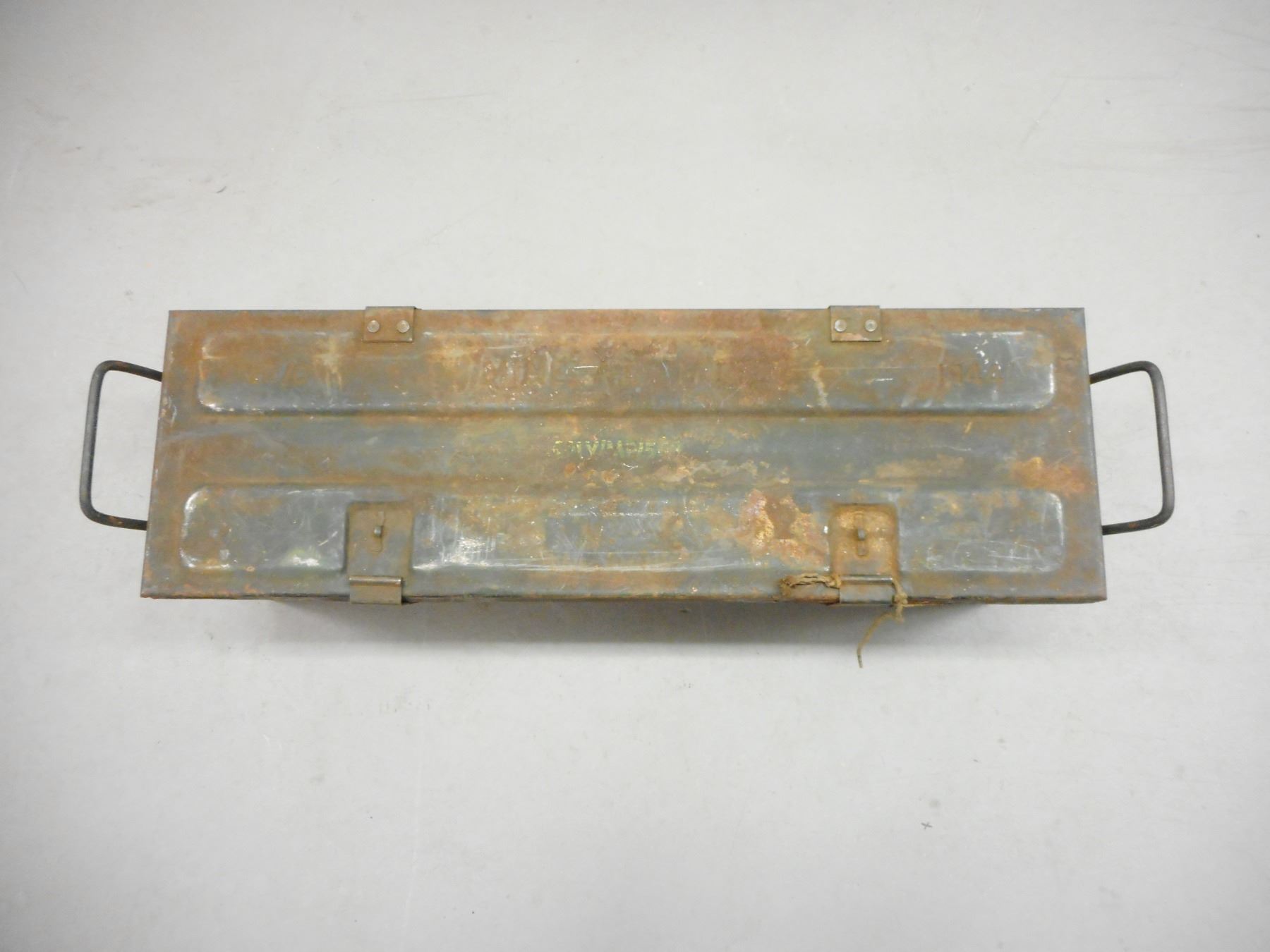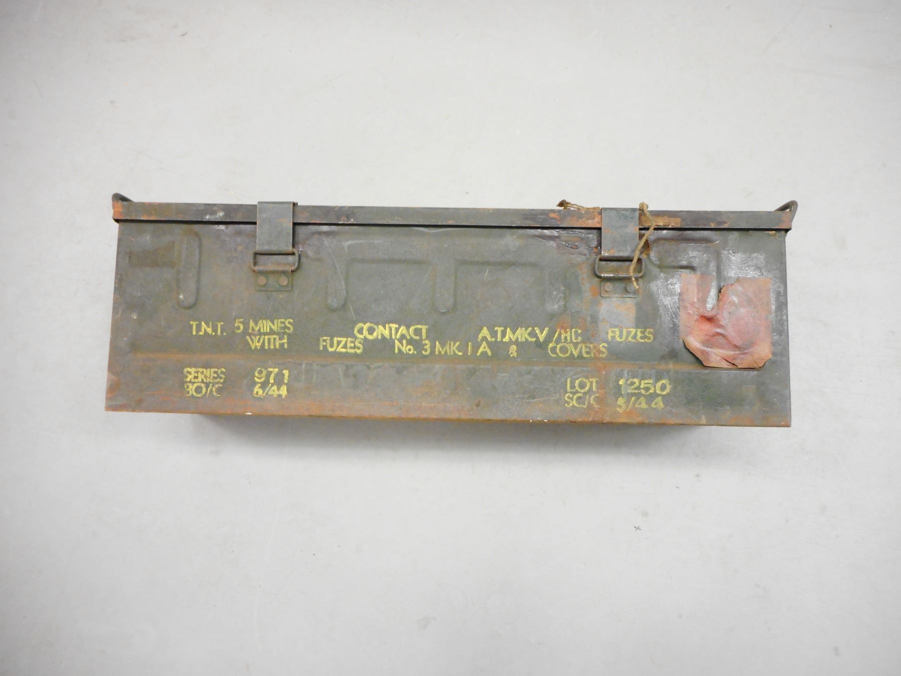 METAL MILITARY TIN , APPROX. SIZE 28.5" X 9" X 9", STAMPED 1944, T.N.T., 5 MINES WITH FUZES, NO3 MK