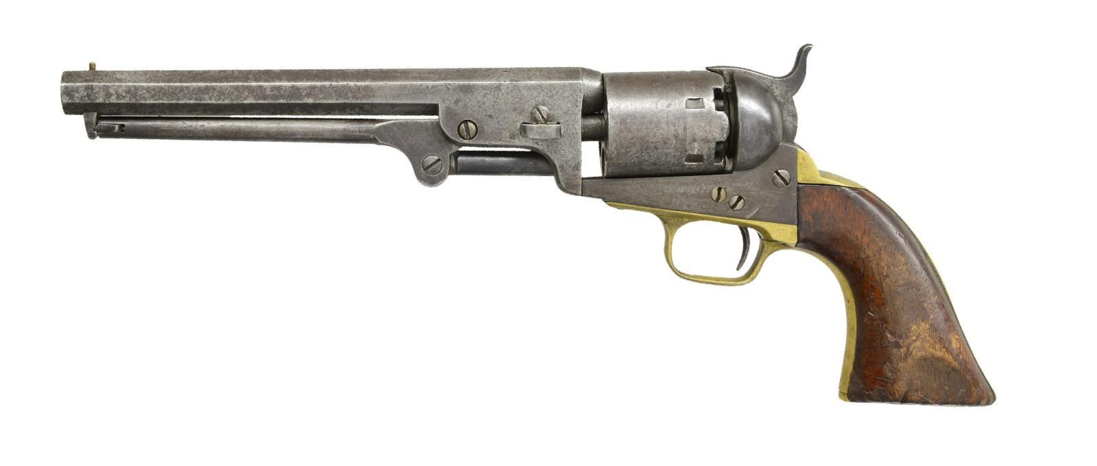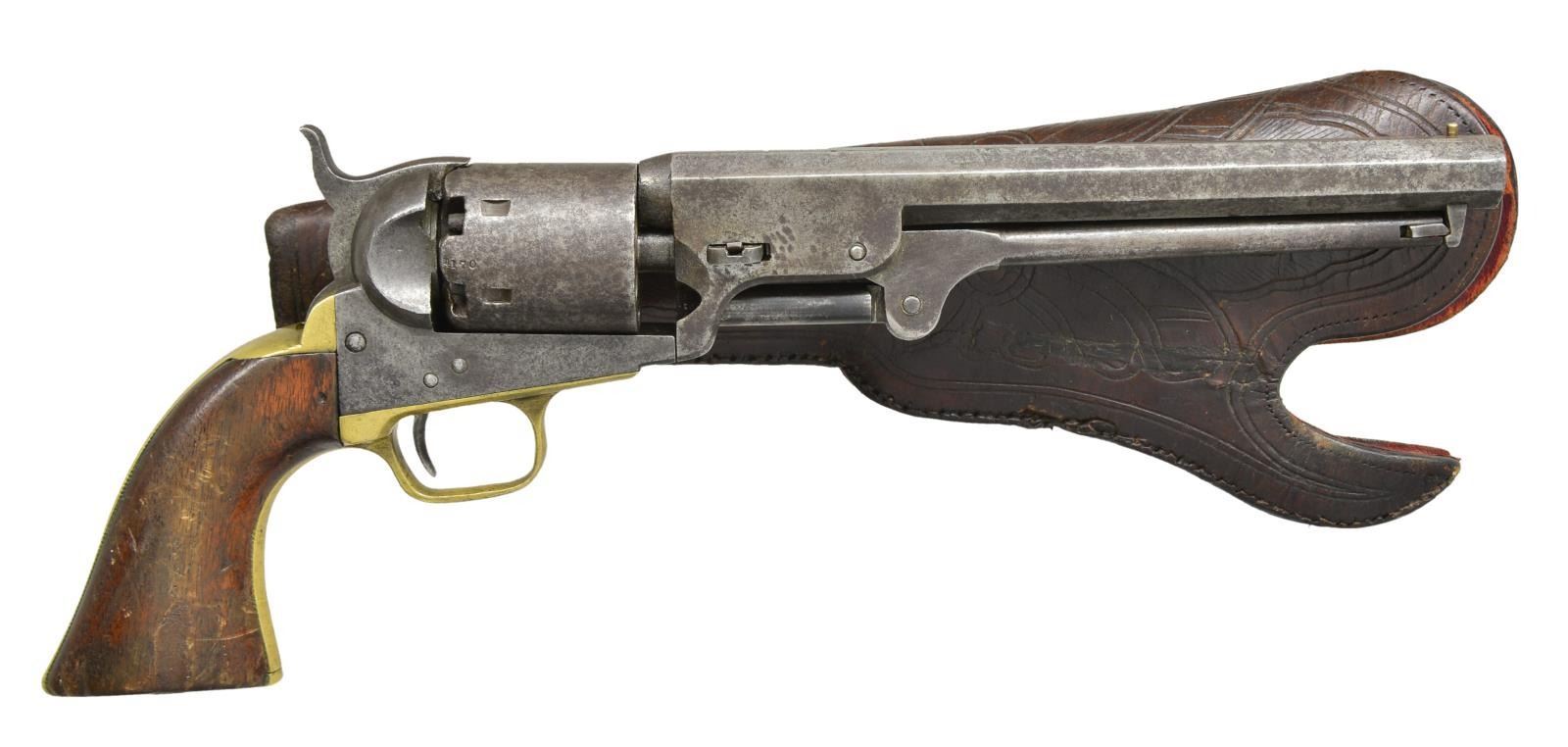 Cal. 36. S# 4170. Bbl. 7 1/2" w/ oct. w/ brass bead sight. Top flat has “METROPOLITAN ARMS CO. NEW YORK” address. 6 Shot rd. roll engraved cyl. 1 Piece walnut grip, left panel has series of 9 cut notches. Bbl. frame, grip straps, cyl. & loading lever have matching numbers. Placement wedge has added number 170. Estimated quantity of 6,063 mfg. 1864-1866. UNATTACHED ACCESSORIES: unmarked embossed lined leather holster. Front side has hand scratched name that appears to read “E.R. Merrill”. CONDITION: metal has worn gray appearance showing handling marks & spots of light pitting. Grip straps show past cleaning. Grips show heavy wear w/ dents & handling marks. Action is worn and will not hold in full cock position. Dark lightly pitted bore w/ intact rifling. PROVENANCE: Collection of John Montague. (01-20769/DS). ANTIQUE. $700-900.
