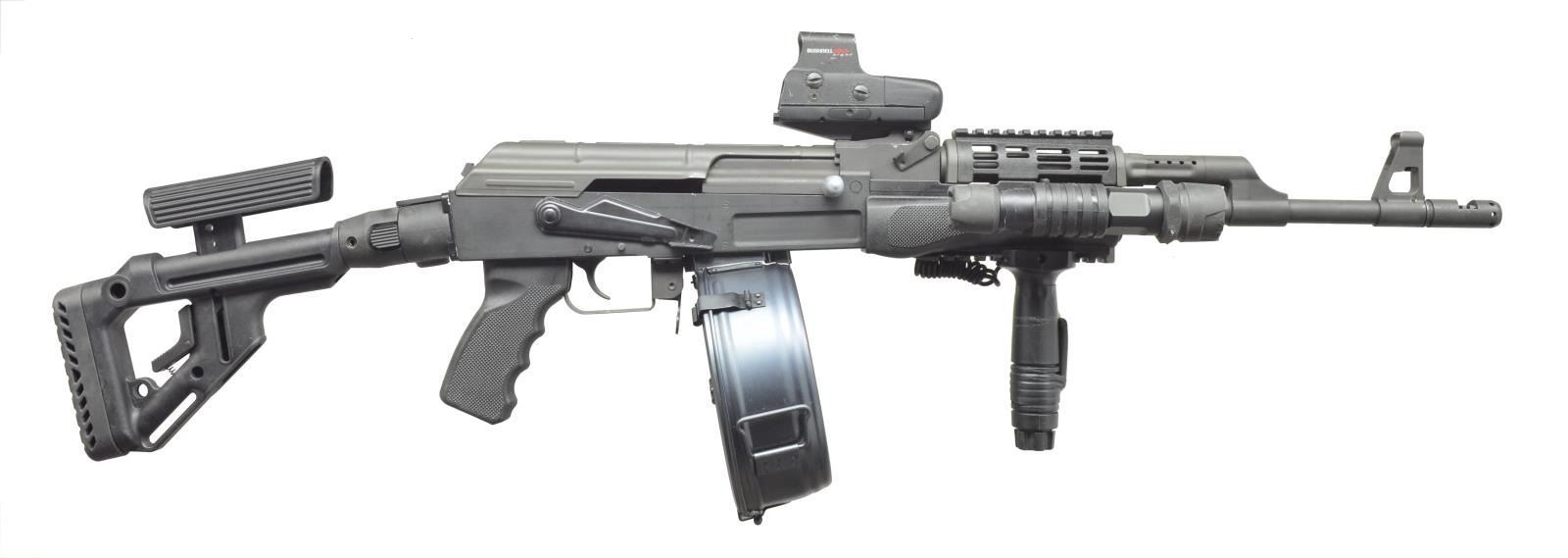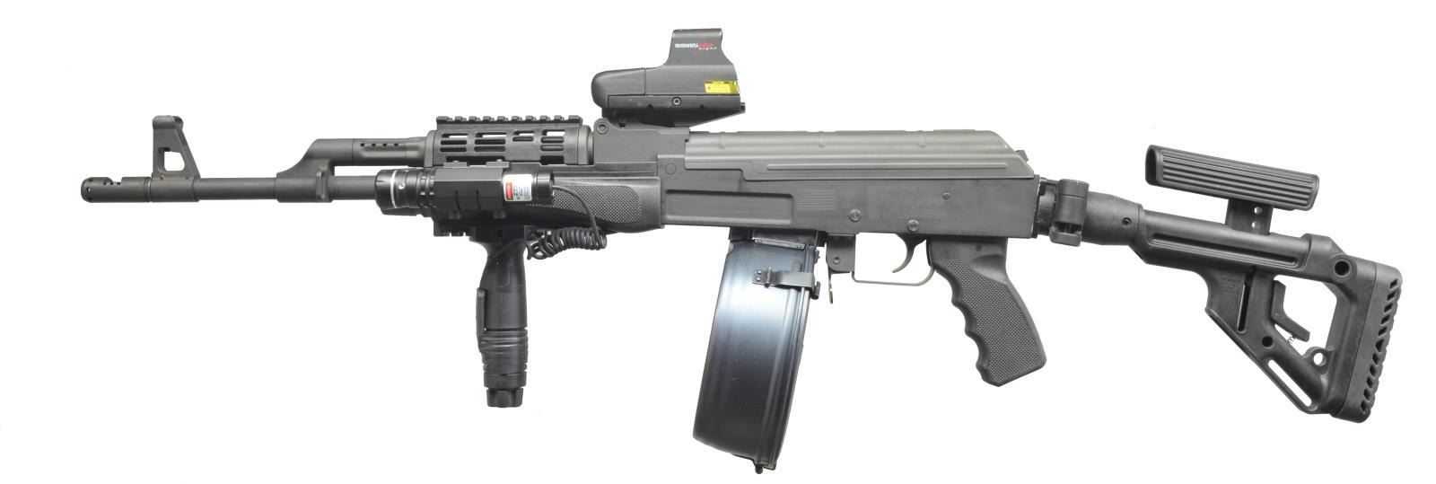 Cal. 7.62X39. S# C39WM-001265. Bbl. 16". A milled receiver entrant in to the United States civilian Ak47 market. Heavy lightening cuts overlap the magwell on both sides w/ a 1" American flag engraved to the rear on the left side. Bbl. terminated w/ threaded muzzle & brake doubling as a thread protector. Traditional protected post front sight has been upgraded to a Trijicon luminous dot. No bayonet lug. Front hand guard offers picatinny rail mounting sections around the clock. VFG mounted below bbl. & hosts a pigtail pressure switch for green laser mounted at 9:00. Weapon light mounted at 3:00. Rear trunnion sight has been replaced w/ a picatinny rail mount currently hosting Bushnell HOLO sight. Right side safety selector. Hard plastic checkered pistol grip w/ finger grooves. Left side folding FAB Defense stock w/ adj. cheek rest & rubber butt pad. MAGS: 1 Romanian rear loading 75 rd. drum & 1 metal 30 rd. CONDITION: by all outward appearances this firearm has been utilized very little if any at all. The line that forms on the receiver below the safety selector has yet to penetrate the finish. Bore is shiny w/ decent rifling & fire control mechanism appears to function correctly when cycled by hand. Both magazines appear unused. (21-1505/JZ). MODERN. $400-700.
