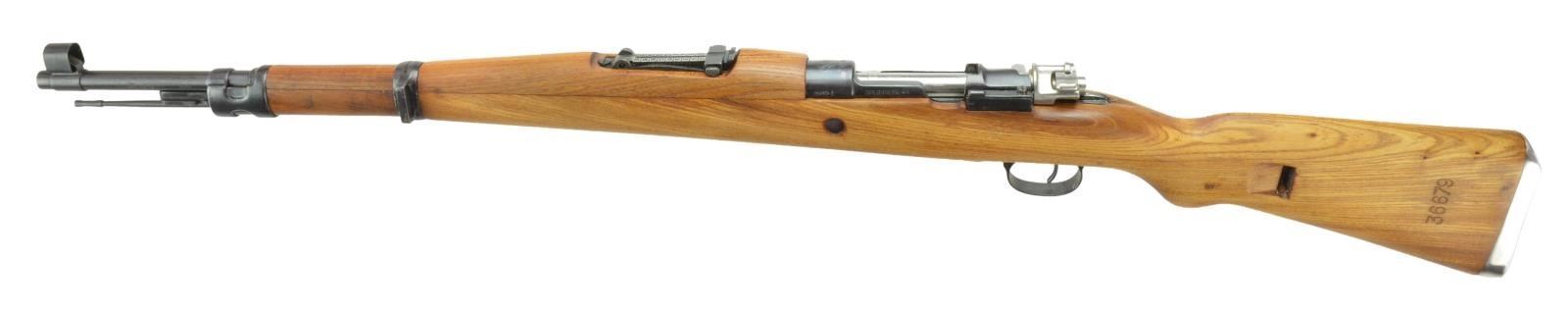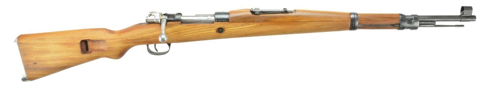 ACTION RIFLE. Cal. 8x57 (8mm Mauser). S# T36679 (Importer S# 30039). Mfg. 1950-1952 by Zastava as a post WWII copy of the German 98k rifle, imported by Mitchell's Mausers & refurbished in the US. Bbl. 23.5" w/ hooded blade front sight & 2,000m tangent rear sight. Receiver ring has Communist crest. Matching numbers on bolt, floorplate & hardwood stock. Cleaning rod is present. CONDITION: very good overall as refurbished. Near excellent bore. (22-1477/MD). CURIO. $400-600.