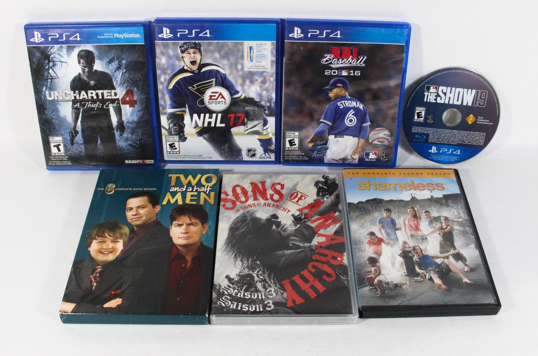 4 PS4 GAMES THE SHOW 19, NHL 17, RBI BASEBALL 2016, UNCHARTED 4 A THIEFS END ALONG WITH 3 TV SEASONS: SHAMELESS SEASON 2, SONS OF ANARCHY SEASON 3, TWO AND A HALF MEN SEASON 6