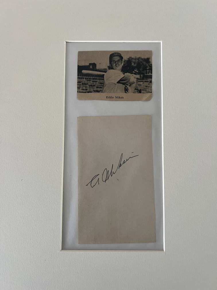 MLB Eddie Miksis signed collage. Signature is 5 x 3 inch and outer dimension of matte is 11 x 14 inch