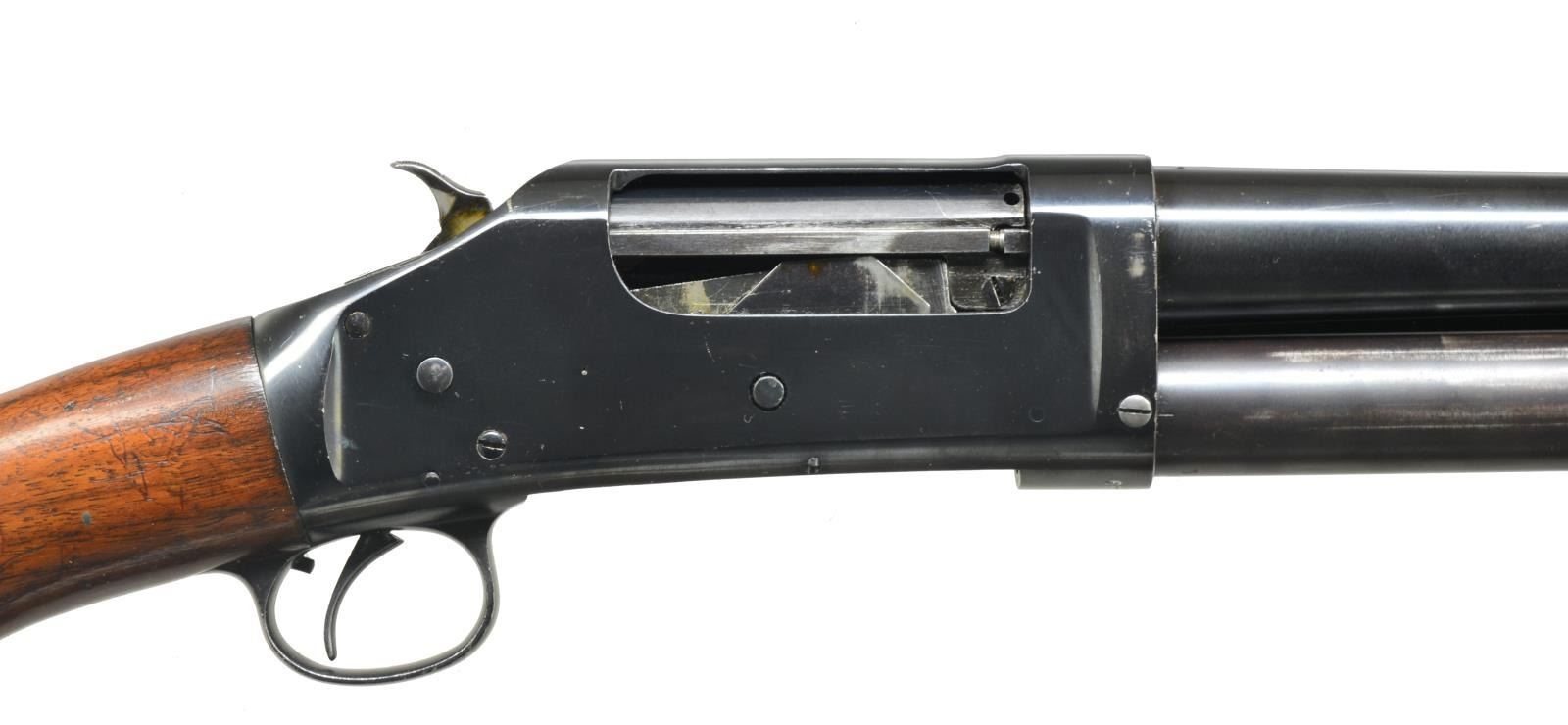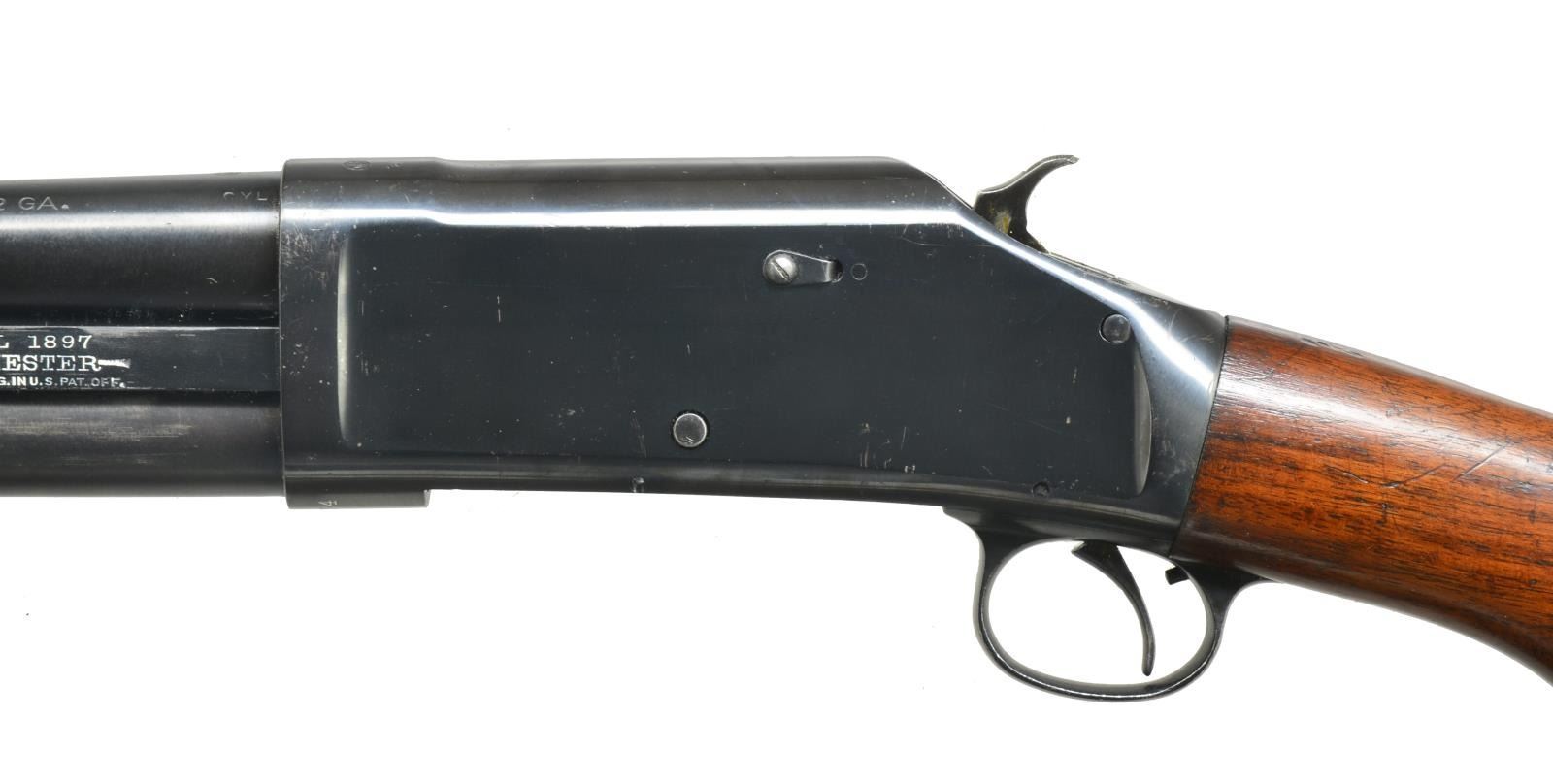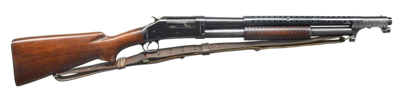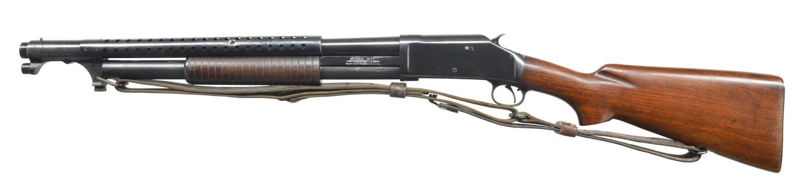 Cal. 12 Ga., 2 3/4" chamber. S# 693554. Bbl. 20 1/2" cyl. marked bbl., fitted w/ heavy bayonet lug & ventilated heat guard. Typical solid frame blued 97 action has Winchester proof on top. Pistol grip American walnut stock is fitted w/ Winchester steel buttplate. Forend has 18 grooves. Gun is fitted w/ “CHICAGO BELTING COMPANY 1918” marked sling. CONDITION: very good as refurbished. Metal parts retaining over 95% reblue most loss due to cleaning on left side of bayonet lug assembly. Stocks have numerous light & heavy handling marks in what appears to be their original finish. Shiny bore. Mechanically good. (20-3383/MGM). MODERN. $1,500-2,200.
