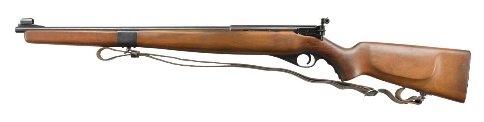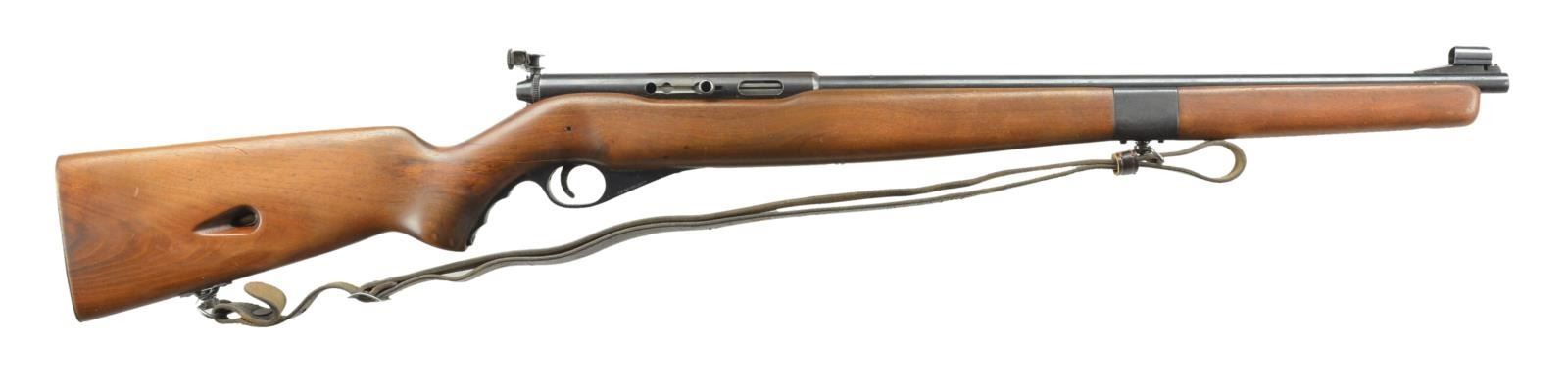 Cal. 22 LR. NSN. Bbl. 20". Hooded ramp front sight w/ interchangeable posts & Mossberg S-130 receiver sight. Receiver is grooved for tip off scope mts. Tubular magazine inserts through buttplate & loads on right side of stock. 2 Piece full length walnut stock w/ steel buttplate & plastic trigger guard having a leather sling on original swivels. Mfg. 1947-1958. CONDITION: 70% lightly faded blue showing spots of corrosion. Stock has worn finish & is broken through wrist. Bright bore w/ strong rifling. PROVENANCE: from the estate collections of Charles P. Obremski. (22-1352/DS). CURIO. $100-200.