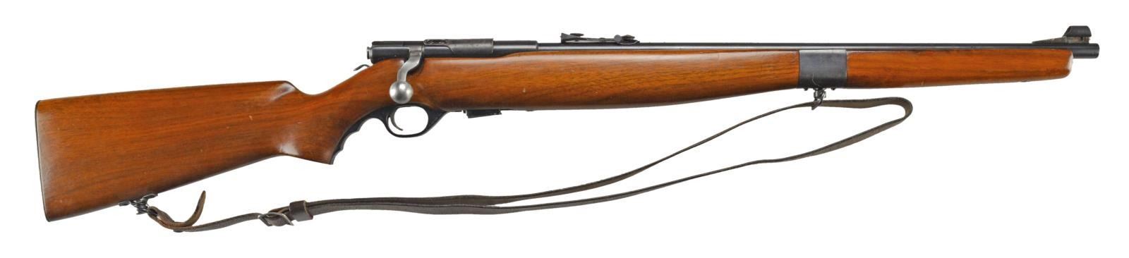 Cal. 22 S, L, LR. NSN. Bbl. 23" w/ ramp mounted front sight having interchangeable posts & replacement hood. Wheel adj. rear sight. Bolt is fitted w/ dust cover & top tang safety. Action has added holes w/ plug screw for scope attachment. 2 Piece full length cheekpiece walnut stock w/ grooved steel buttplate & plastic trigger guard. Leather sling on original swivels. Mfg. 1940-1944. MAGS: 1 detachable 7 rd. CONDITION: 80% lightly faded blue. Sanded & refinished stock shows scattered handling marks. Bore retains strong rifling. PROVENANCE: from the estate collections of Charles P. Obremski. (22-1376/DS). CURIO. $200-300.
