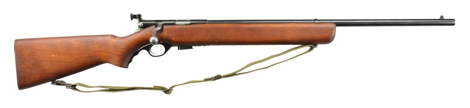 TARGET RIFLE. Cal. 22 LR. S# 159143. Bbl. 26" target weight w/ a blade front sight & Mossberg Micro Click S-100 target rear sight. Front receiver ring is marked "U.S. PROPERTY". Blue finish w/ case colored bolt. Top tang safety. Hardwood target stock w/ grooved steel buttplate & plastic trigger guard. Mfg. 1943-1945. MAGS: 3 total. 1 Original & 2 replacement 5 rd. detachable. CONDITION: over 95% blue showing sm. handling marks & spots of finish loss. Stock shows scattered scratches & marks. Bright near excellent bore. PROVENANCE: from the estate collections of Charles P. Obremski. (22-1288/DS). CURIO. $300-500.