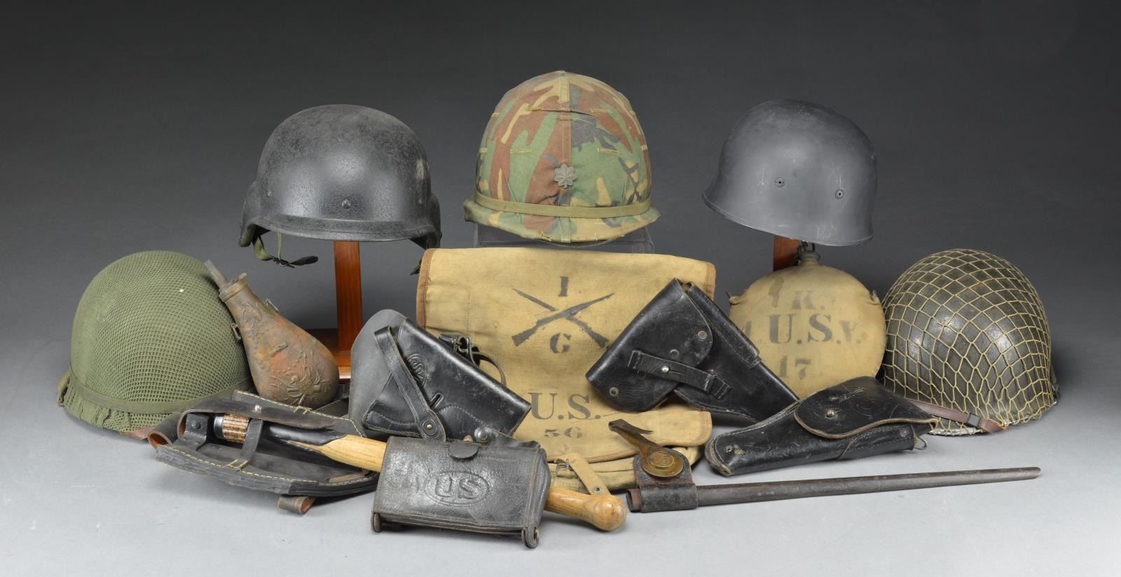 Notable items include: Spanish American War canteen w/ cork top & chain marked on outer cover "K. / 4 U.S.V. / 17". / Spanish American War Knapsack marked w/ 1 / G / U.S. 56". Good stained overall condition. / 6" Lg. powder flask w/ US themes on body. Fair tarnished oxidized appearance. / Indian War bayonet scabbard, frog & belt strap for 1873 Trapdoor bayonet. Fair appearance. / Indian War Rock Island Arsenal McKeever 45-70 cartridge box in fair condition. / Vietnam era Nordac black leather shoulder holster for 1911 w/ shoulder strap. / Vietnam era Bolen black leather holster for 1911. / Post WWII German Police P38 holster. / Repro. German WWII klappspaten folding shovel w/ leather cover. / 5 helmets: including PASGT Unicor, 3 Vietnam War M1 w/ liners. / CONDITION: unless otherwise state in good to very good appearing serviceable condition. PROVENANCE: from the estate collections of Charles P. Obremski. (02-16640/MD). $200-300.