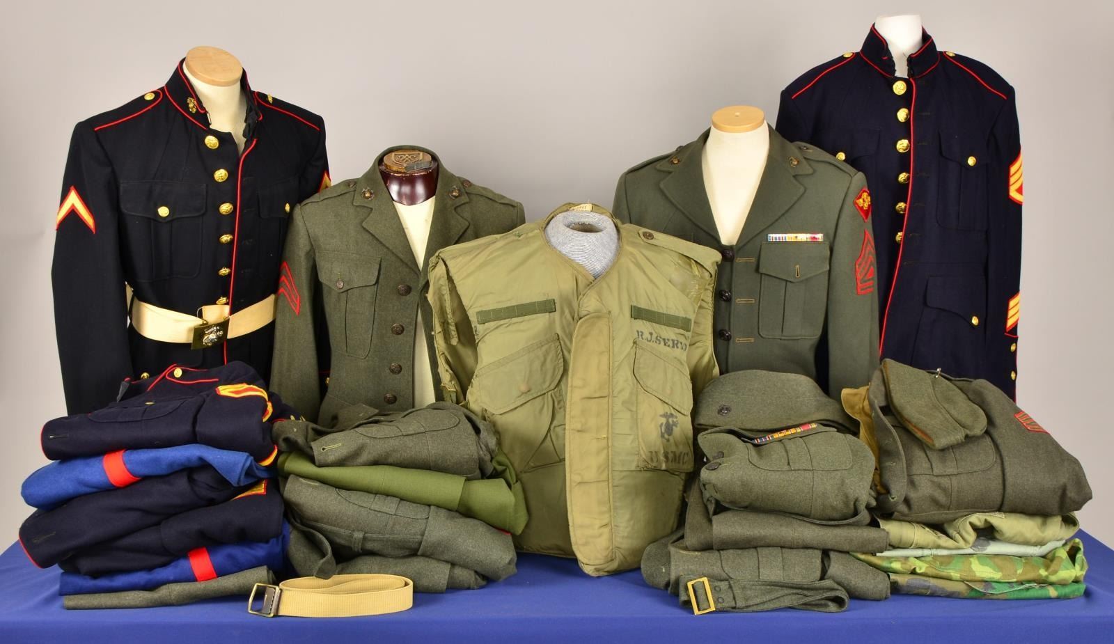 This group includes an Ike jacket & pants for a Gunnery Sergeant of the 1st Marine Air Wing. / Uniform coat, pants & belt for a Sergeant in the 3rd Marine Division. / WWII Marine fatigue shirt. / Dress blue uniform & pants for a Gunnery Sergeant in the 1st Marine Division. / Camouflage BDU for a Marine. / Flak jacket for a Marine. / WWII Marine work shirt. / Camouflage snap front Marine coat. / Dress blue uniform coat for a Private in the Marines. / Dress blue uniform coat for a Corporal in the Marines. / 2 Uniform coats & pants for a Corporal in the Marines. / Dress blue uniform & pants for a 1st Sergeant in the Marines. / Uniform coat & hat for a Corporal in the Marines. / Dress blue uniform coat & pants for a 1st Sergeant in the Marines. / Uniform coat, pants, shirt & hat for a gunnery Sergeant in the Marines. / Uniform coat & pants for a Corporal in the 4th Marine Division. / Uniform coat & pants for a Private in the 2nd Marine Division. CONDITION: uniforms & associated items show light wear except as noted. (02-14452/BF). $900-1,400.