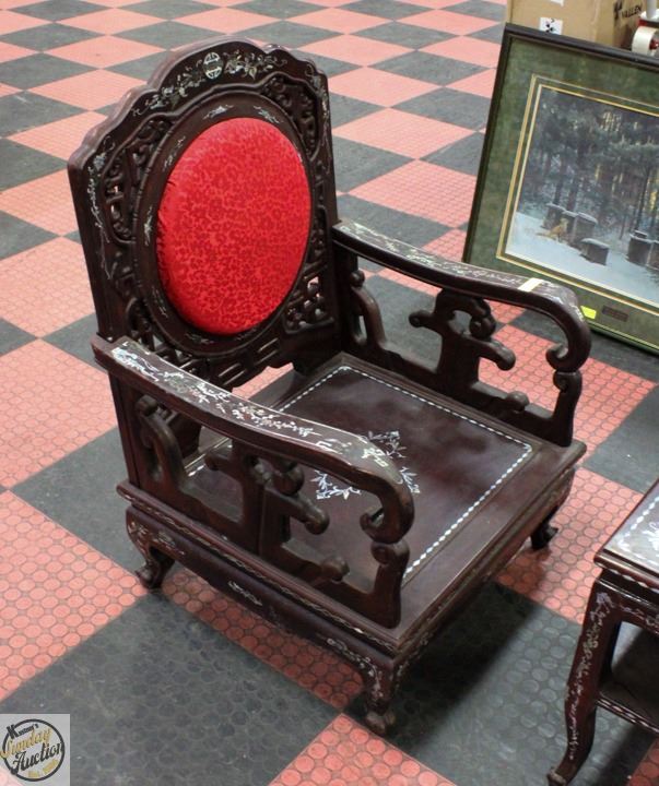 CHAIR, ORIENTAL STYLE FEATURING DRAGON DESIGNS. MISSING SOME INLAY, SOME OF THE HEAVILY CARVED SECTIONS ARE CRACKING. **ALL ITEMS MUST BE REMOVED BY 5PM SATURDAY, DECEMBER 13TH 2025. ALL REMAINING ITEMS WILL BE SUBJECT TO A $6.00 PER DAY STORAGE CHARGE. ANY ITEMS REMAINING AFTER MONDAY, DECEMBER 29TH 2025 WILL BE CONSIDERED FORFEITED. NO REFUNDS WILL BE ISSUED FOR FORFEITED ITEMS. TO SCHEDULE A PICK UP APPOINTMENT CLICK HERE