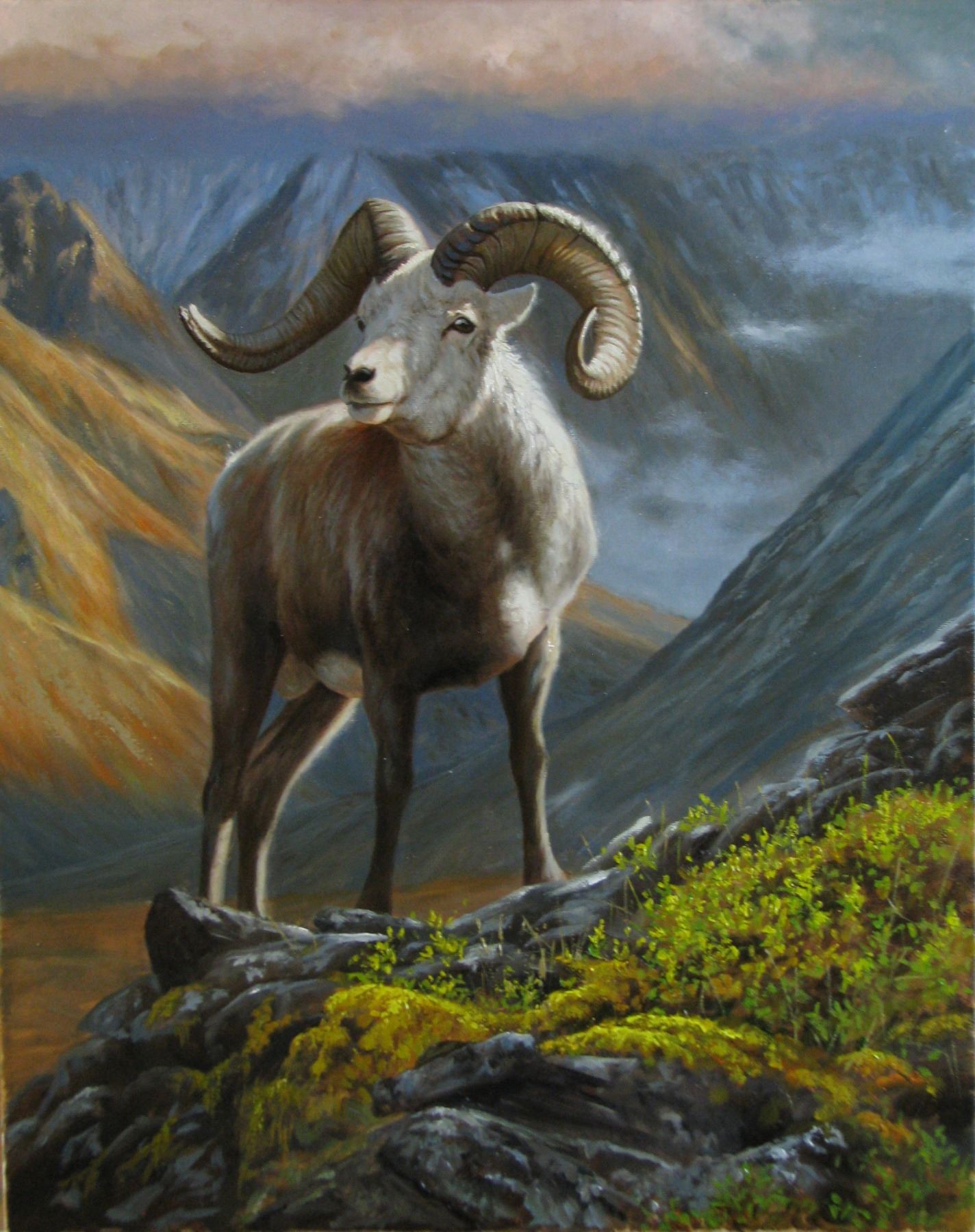 DONATION: Mountain Majesty is an oil painting on stretched canvas. Admittedly, my art depicting Stone sheep has been very limited. That said, I absolutely consider this animal to be our most attractive of the North American species of sheep. Combine their striking aesthetics with the remarkable vistas they call home and you an artist’s wonderland.