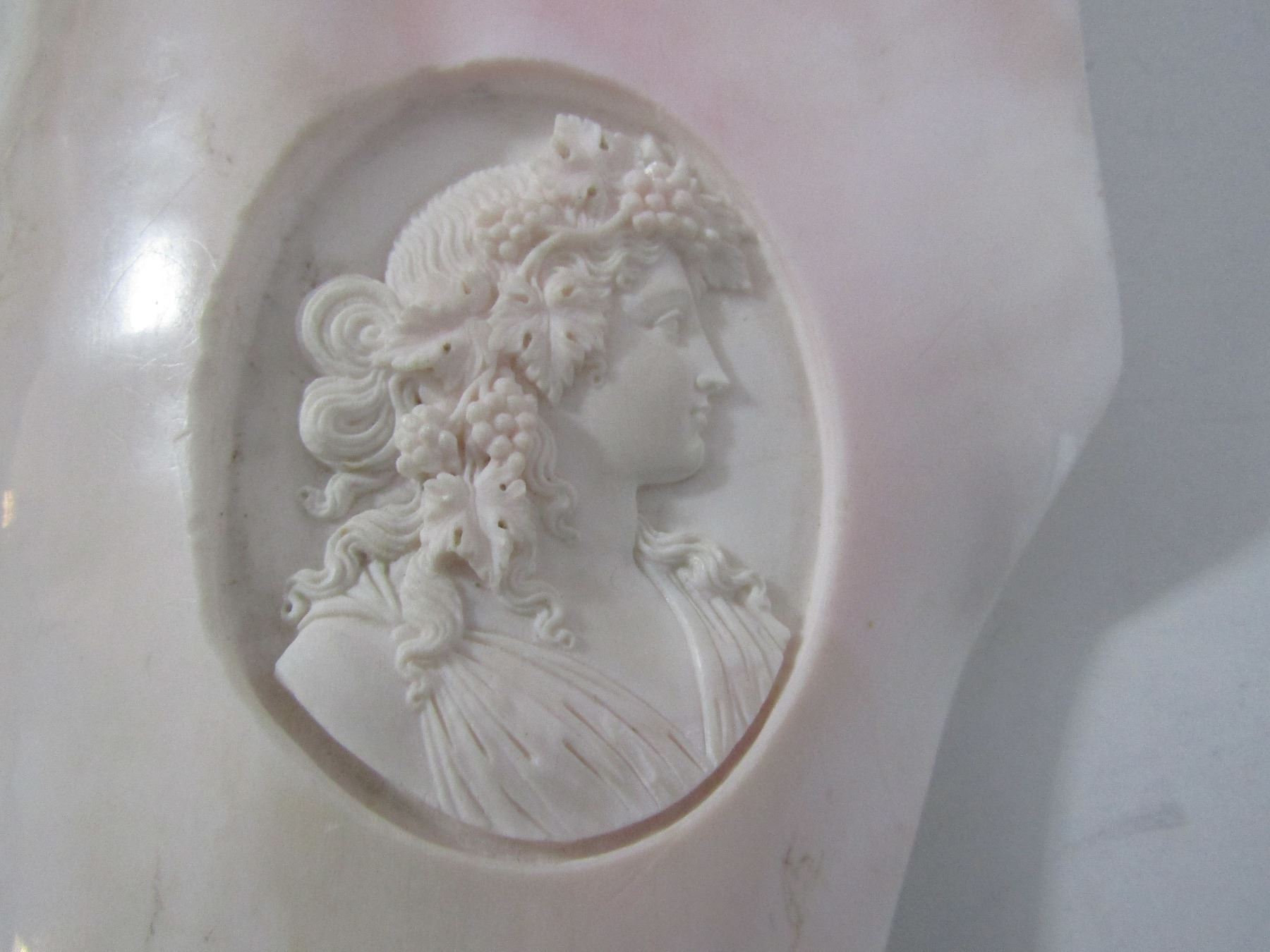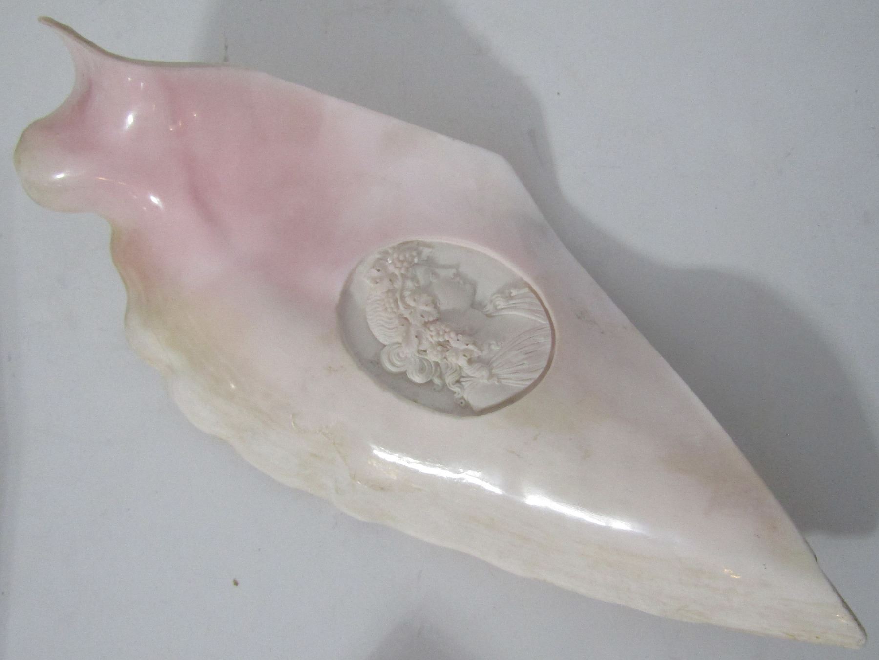 FABULOUS CARVING, VINTAGE ESTATE. SHELL 10 INCHES BY 4.5 INCHES. CAMEO 44MM BY 57MM. WEIGHS 529.5 GRAMS. EXCELLENT CONDITION. USA SHIPPING $10.