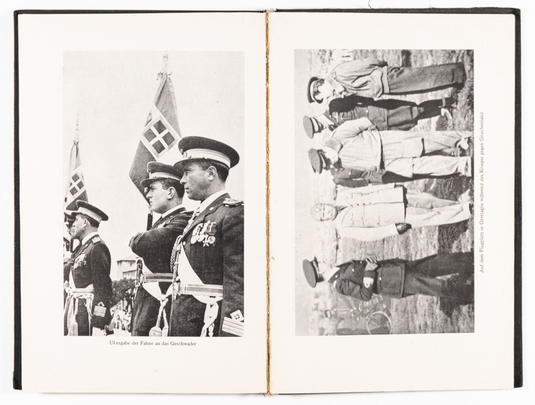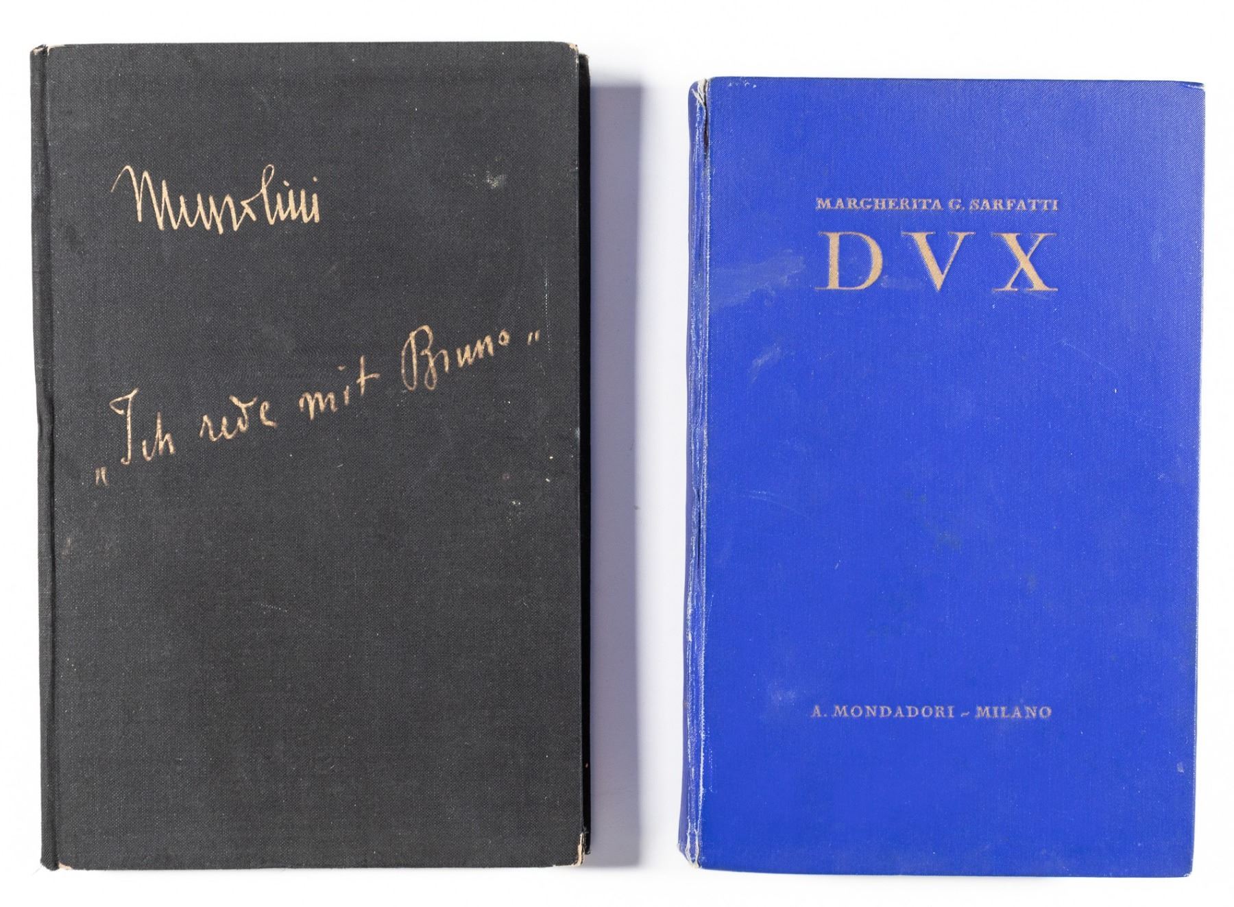 Lot of two books about Benito Mussolini. 1. 'Dux', by Margherita G. Sarfatti, Casa Editrice A. Mondadori, 1926, 326 pages, Italian text, unknown signature on title page, previous owner's Ex Libris on inside cover. Damage on binding and spine. 2. 'Ich rede mit Bruno', Benito Mussolini, Essener Verlagsanstalt, 1942, 160 pages, German text. Damage on spine and binding. Approx. 9 x 6 inches.