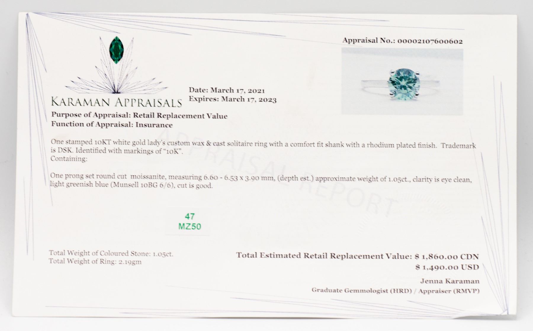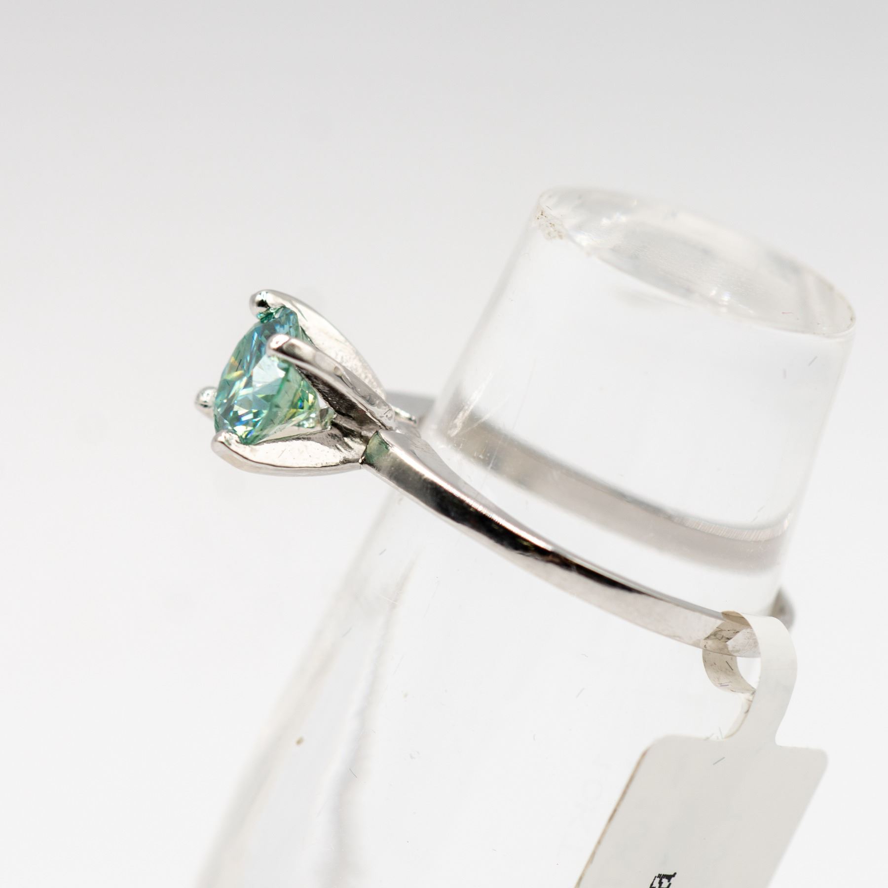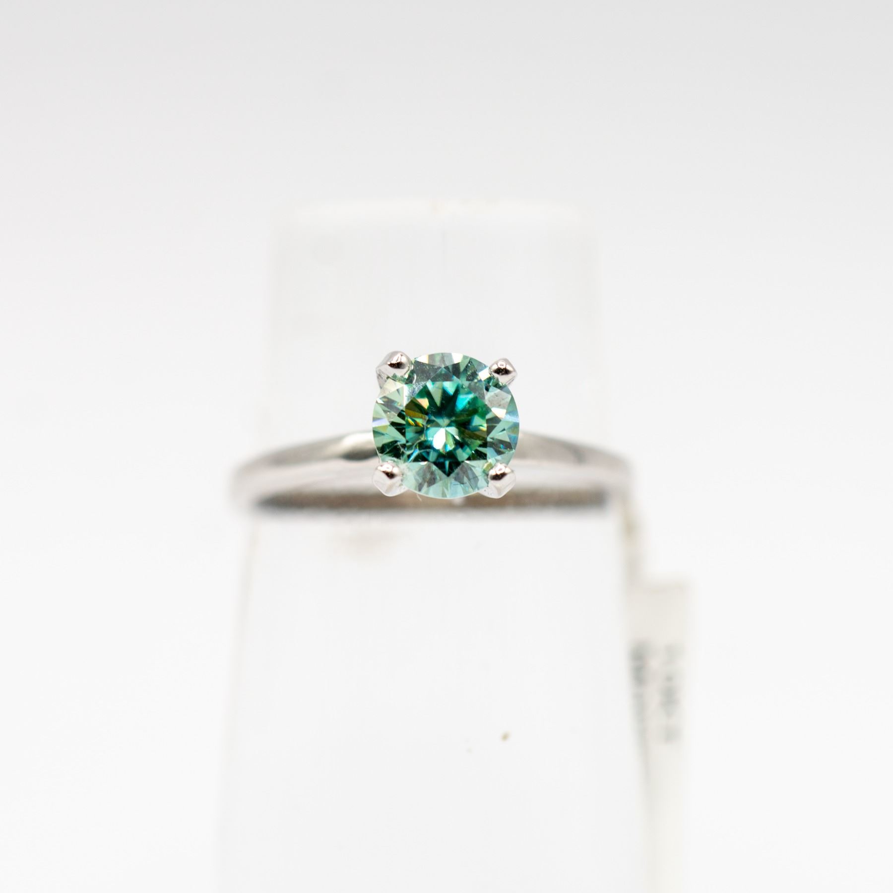 RHODIUM PLATED FINISH , ONE PRONG SET ROUND CUT MOISSANITE MEASURING 6.60 - 6.53 X 3.90mm. CLARITY IS EYE CLEAN, LIGHT GREENISH BLUE, CUT IS GOOD. COMES WITH CERTIFICATE OF AUTHENTICITY, VALUED AT $1,860.00