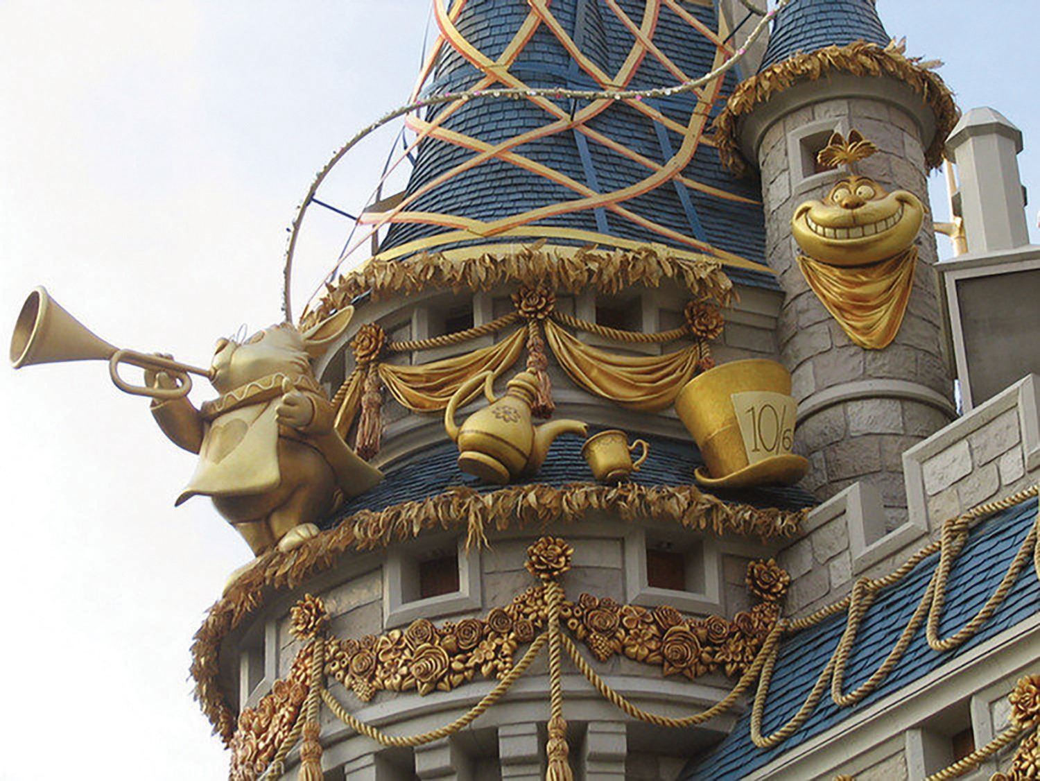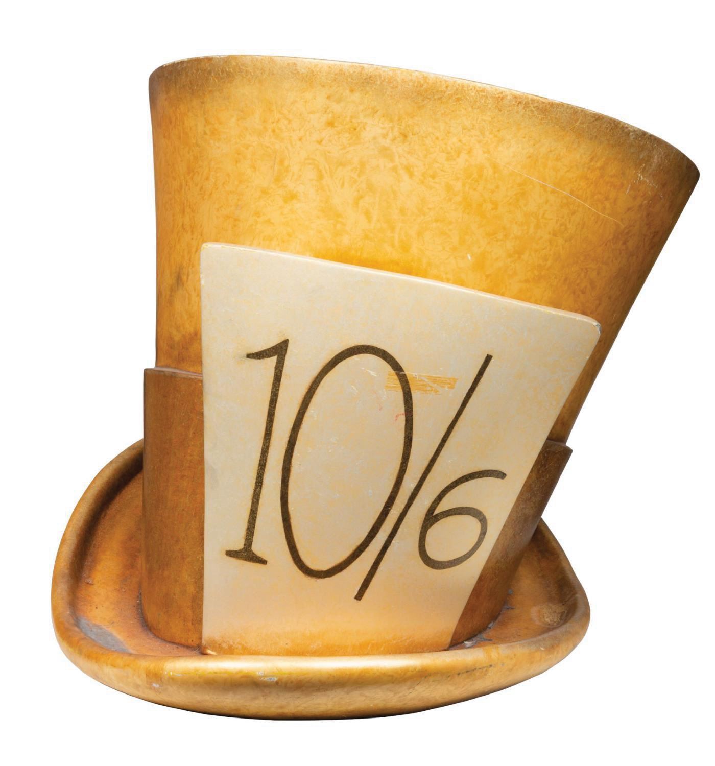 (Walt Disney World, 2005) An oversized Mad Hatter hat display prop created for Cinderella Castle ornamentation in honor of the "Happiest Homecoming on Earth" celebration at Walt Disney World Resort. During the celebration events, golden characters and artifacts of memorable Disney films spanning 50 magical years contributed to a grand royal makeover of Cinderella Castle, with this prop enhancing the Alice in Wonderland section of the Castle structure. Measuring 31" tall and approximately 31" in diameter (not including the support rod), the steel and Fiberglas Park-used prop displays in very good condition, showing few scuffs and scratches from original outdoor display. This item may require special shipping arrangements, please inquire for details and estimates.