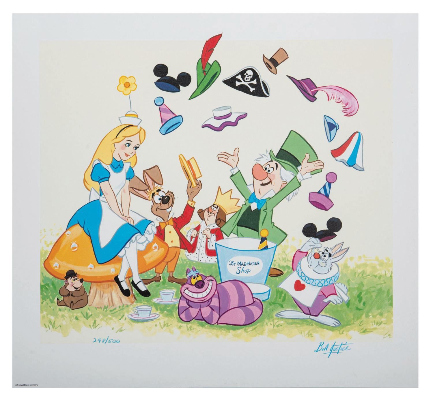 (Disneyland, 1995) A limited edition print signed by Bill Justice depicting an Alice in Wonderland scene. The scene was celebrating the stock of the original Mad Hatter Shop and was originally created for a mural that was featured in the Fantasyland shop from 1977 to 1983. Measuring 22"x24", the print bears the official "Disney Gallery Images" embossed seal, is hand-numbered "298/500", signed by the Legendary character animator Bill Justice, and retains a Disney Gallery COA.