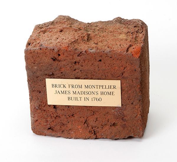 [madison, James] Foundation Brick From Montpelier. Foundation brick from Montpelier, home of President James Madison, located near Orange, Virginia. The brick is 3� x 4 x 2� in. and has a plaque which says, "Brick from Montpelier / James Madison's Home / Built in 1760." Monpelier went through three phases of construction from 1764 to 1812. Madison (1751-1836) lived there as as a boy and brought his bride, Dolley Payne Todd Madison (1768-1849) to live there. Dolley sold Montpelier in 1844, choosing to live in Washington, D.C. as a widow and Montpelier remained in private hands until 1983, when Marion duPont Scott bequeathed the property to the National Trust for Historic Preservation, along with a $10 million endowment to buy and maintain it. The organization has worked to restore Montpelier to the Madison era. Ex Claude Harkins Collection.