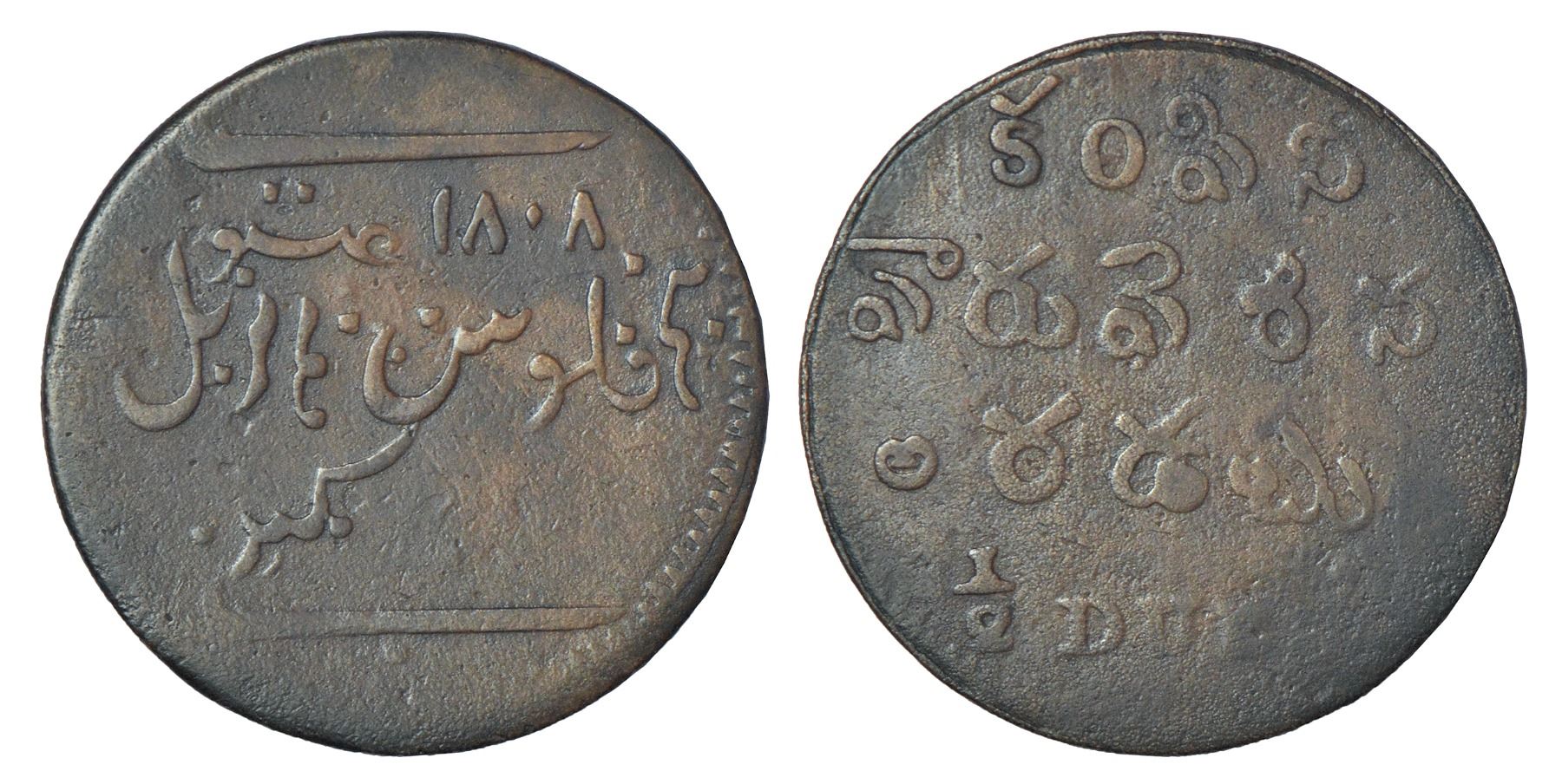 Madras Presidency, Madras mint, copper ½ dub, 1808 (small date), Stevens EIC 3.371, PR 335, 4.69g. Obv: Persian inscription in four line and small date. Rev: Value in Telugu in three lines, denomination below.