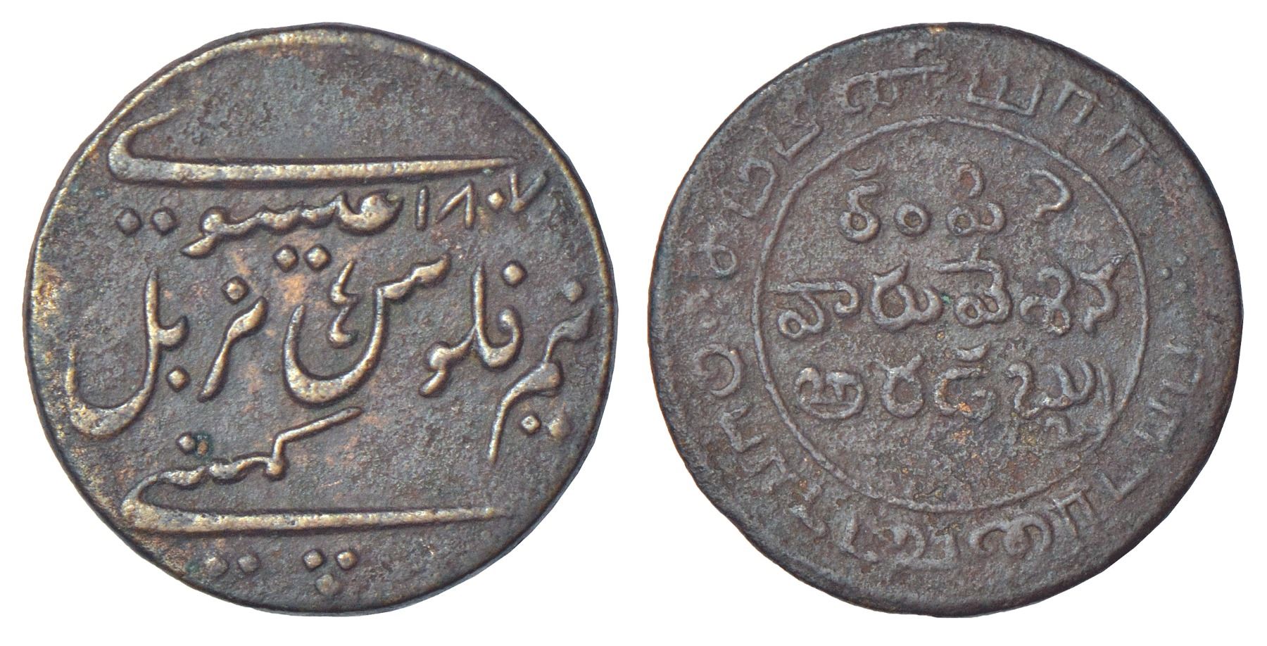 Madras Presidency, Madras mint, copper ½ dub, AD 1807, small date variety, Stevens EIC 3.363; PR 330, 4.88g. Obv: Persian inscription in four lines and date. Rev: Value in Telugu and Tamil.