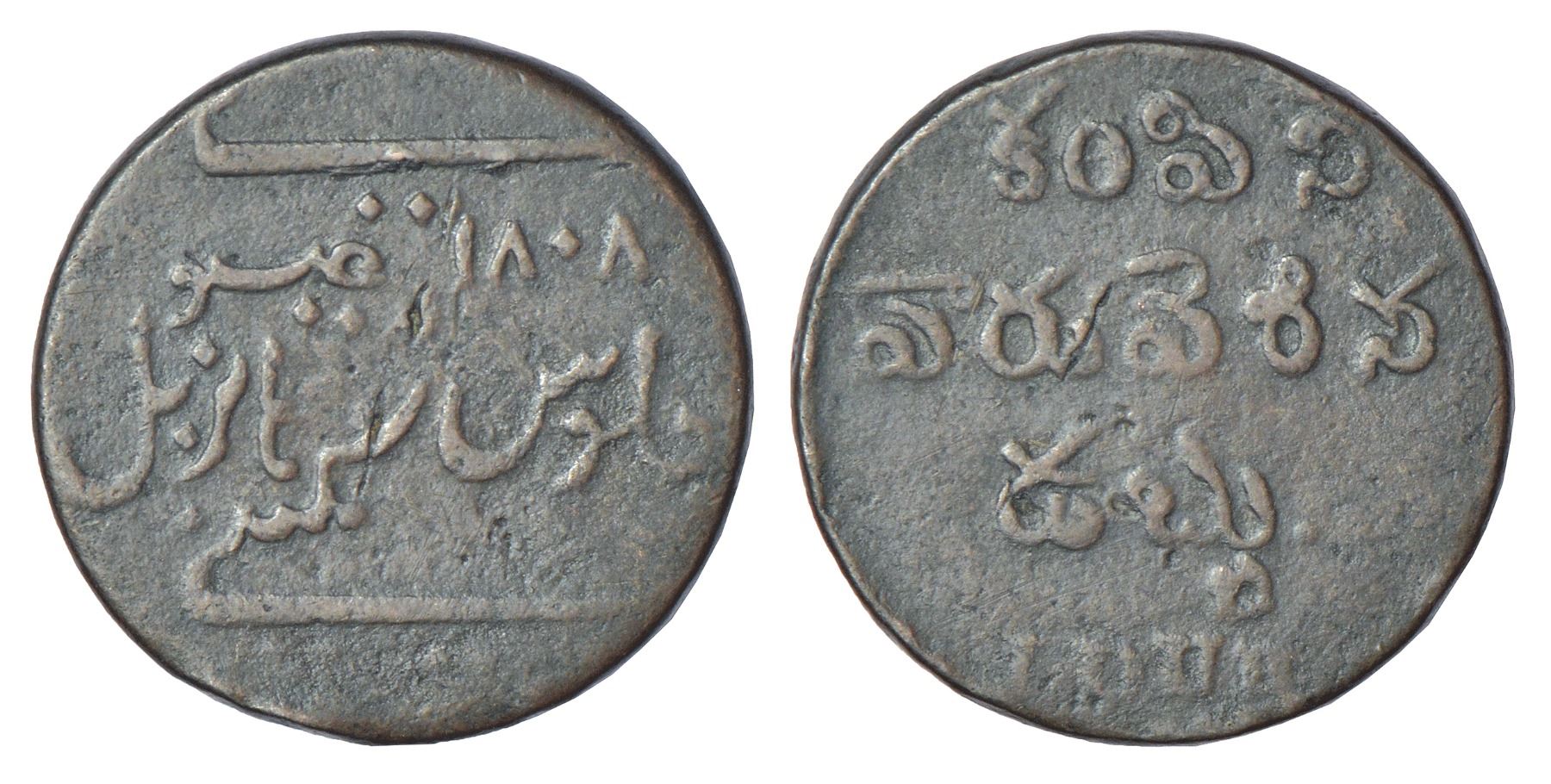 Madras Presidency, Madras mint, copper dub, AD 1808, small flan variety, Stevens EIC 3.370, PR 334, 9.55g. Obv: Persian inscription in four lines and date. Rev: Value in Telugu in three lines and denomination below.