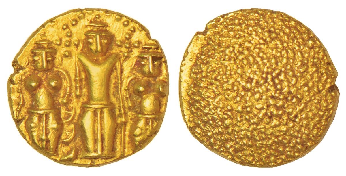 Madras Presidency, Madras mint, early coinage, gold 3 swami pagoda (full figures) ND (1691-1740 AD), KM 289; Stevens EIC 1.3, 3.43g. Obv: God Tirupati Balaji in center with Sridevi & Bhudevi on right and left. Rev: Granulated.