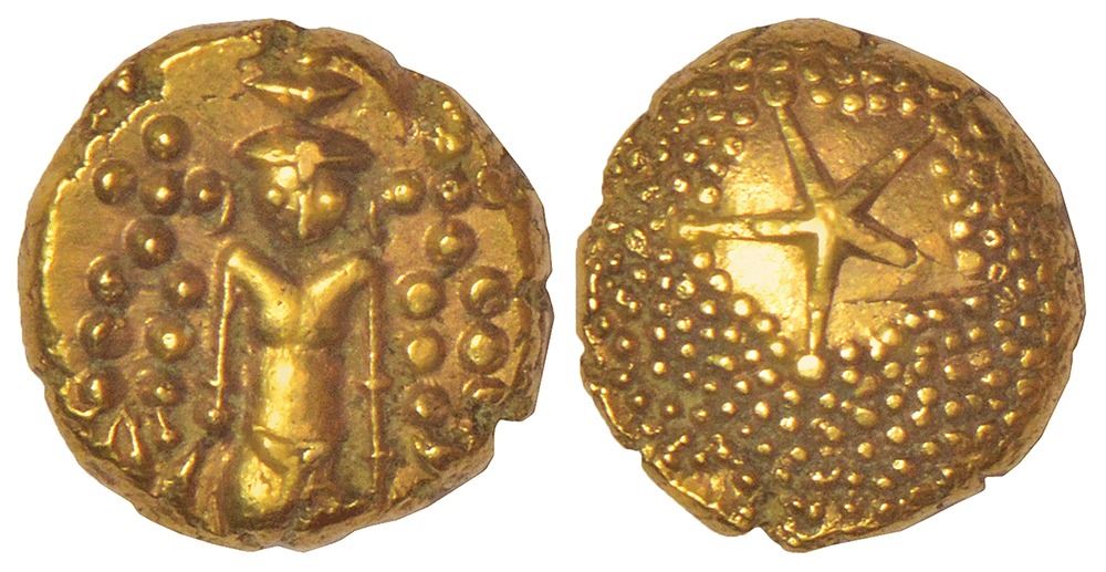 Madras Presidency, Madras mint, early coinage, gold star pagoda, ND (1740-1806 AD), Stevens EIC 1.12, 3.40g. Obv: Venkateshwara standing facing front. Rev: Concentric circles of dots with star.