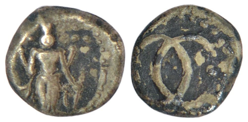 Madras Presidency, Madras mint, second issue, silver fanam, ND (1690-1763 AD), Stevens EIC 1.21; PR 16, 0.96g. Obv: Standing figure of Lord Vishnu. Rev: Two interlinked C, with one dot, surrounded by a beaded border.