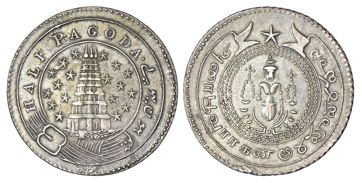 Madras Presidency, Madras mint, second issue, silver ½ pagoda, ND (1808-1812 AD), KM 353, 21.11g. Obv: Value in English and Persian, buckled garter, 9+9 star around both side of Gopuram. Rev: Value in Tamil and Telugu around, deity Vishnu within three circles of beads.