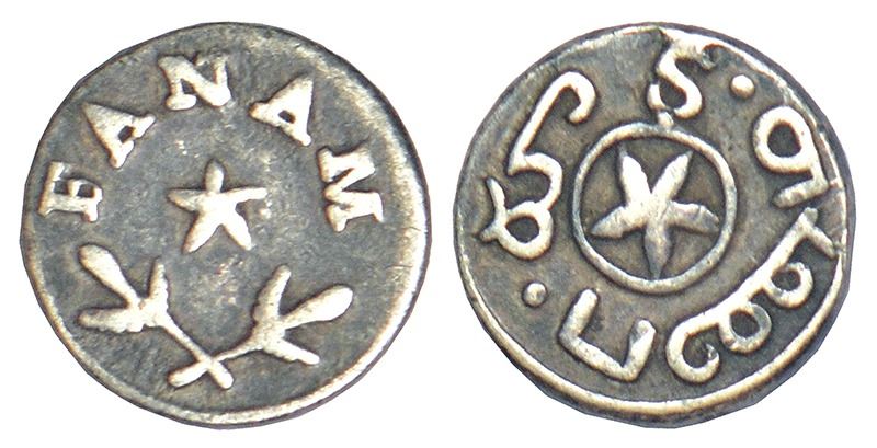 Madras Presidency, Madras mint, silver fanam, first issue, ND (1807-1808 AD), 0.92g. Obv: Star between crossed branches above fanam. Rev: Star in circle, around value in Tamil and Telugu, plain edge, Stevens EIC 3.89.