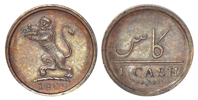 Madras Presidency, Soho mint, copper proof cash, AD 1803, Stevens EIC 5.149c, PR 213, 0.64g. Obv: Lion holding a crown facing to left, with date below. Rev: Value in English and Persian.
