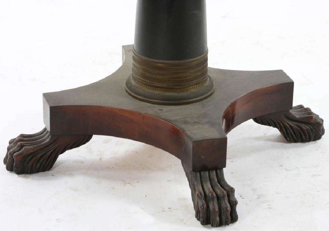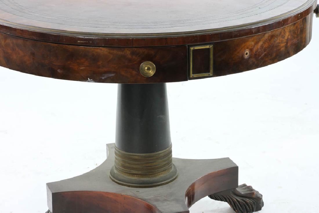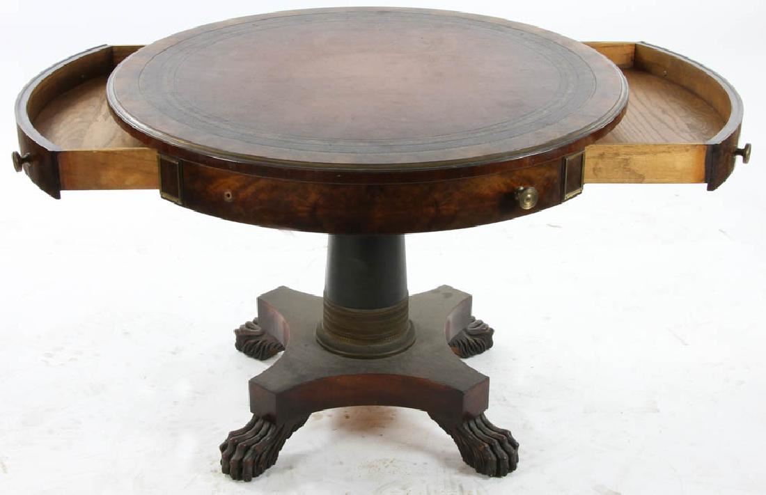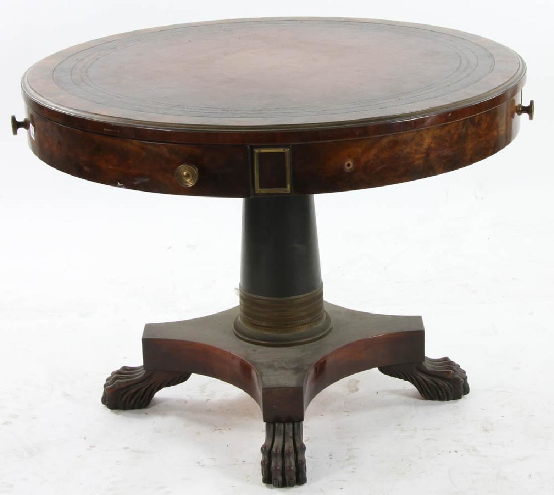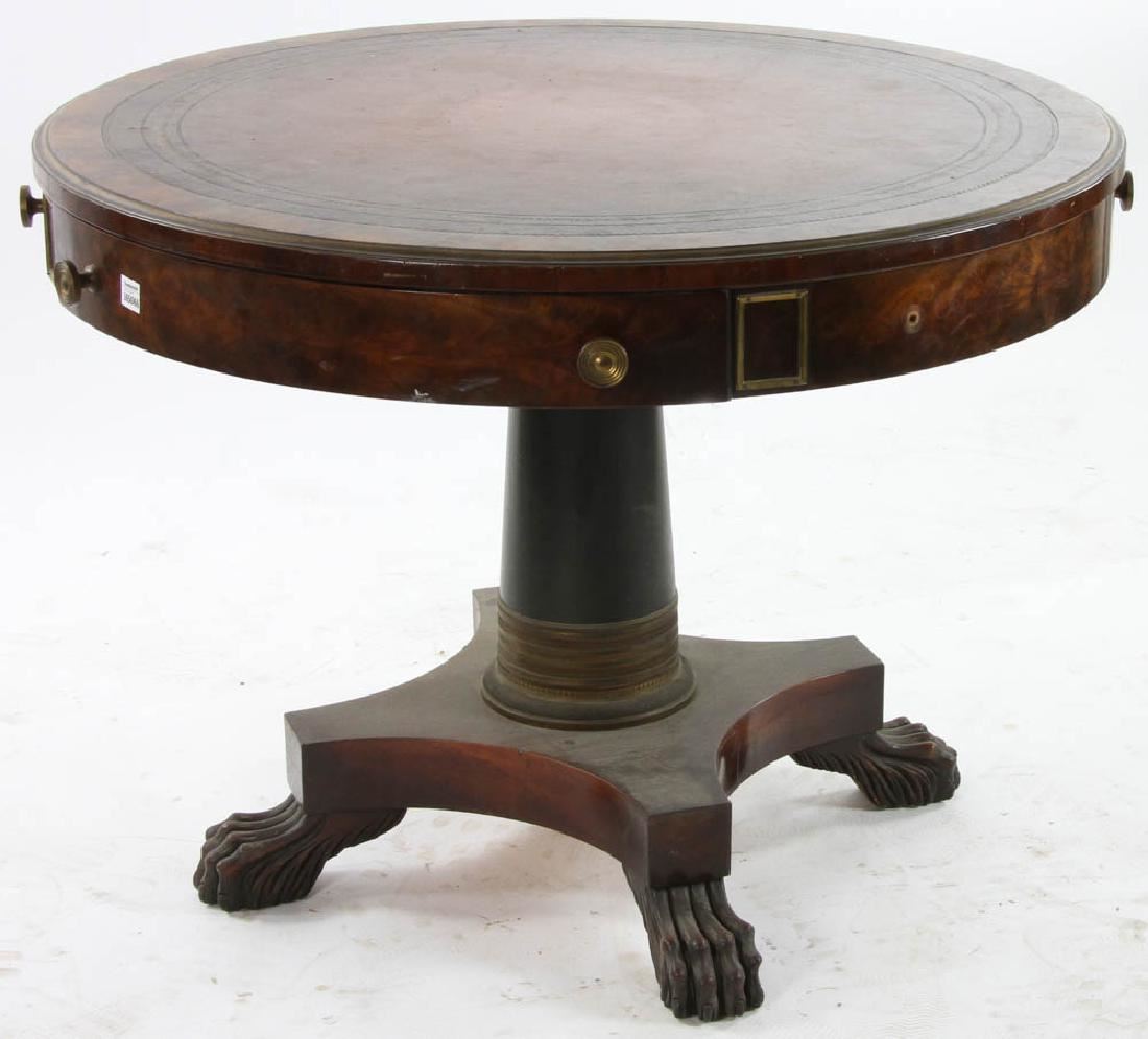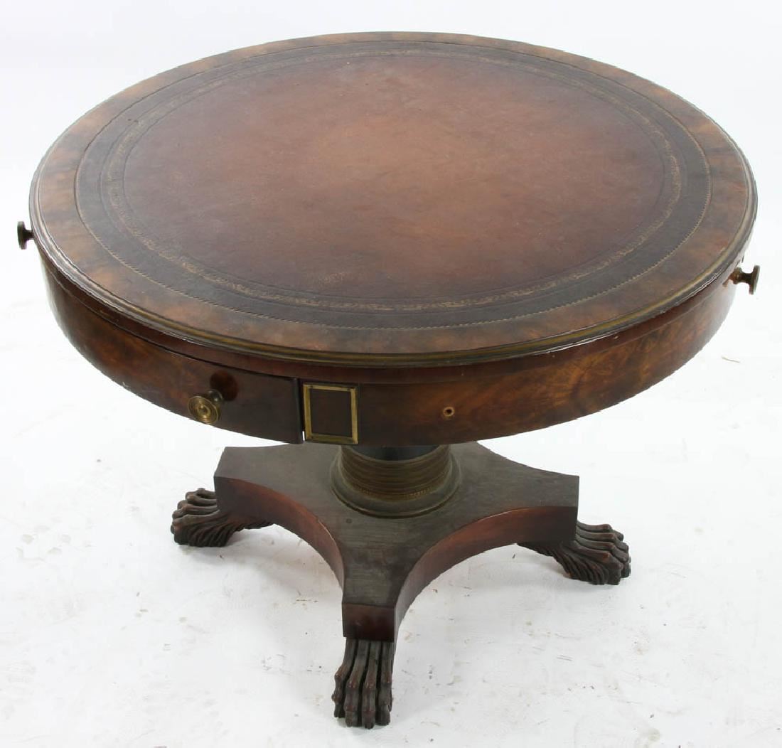 Single-drawer mahogany drum table with leather top and carved paw feet, 28 1/2" H x 38" diameter. Provenance: West Palm Beach, Florida estate.