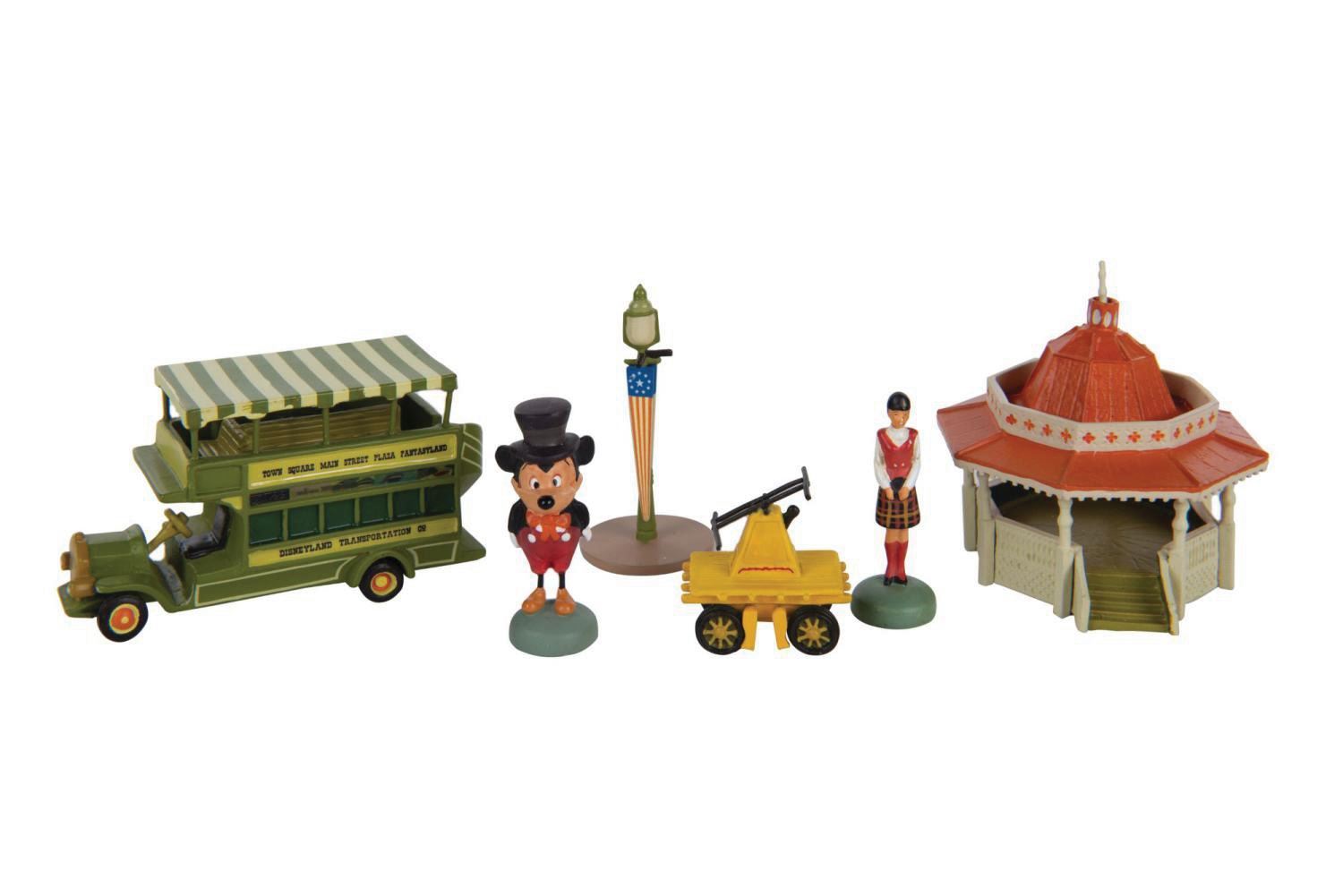 (Disneyland, 2005) A limited edition boxed set of Main Street themed pewter miniatures. Created by Kevin Kidney and Jody Daily to commemorate Disneyland's 50th Anniversary, the set was limited to 1500. The set of (6) figurines highlights several nostalgic elements of this iconic area of the Park, including the Omnibus, Band Stand, Tour Guide, and more. The box measures 7"x10" and 3.5" tall, and is in very fine condition with very minor paint wear to the Omnibus figurine and minor wear to the box. The COA is included.