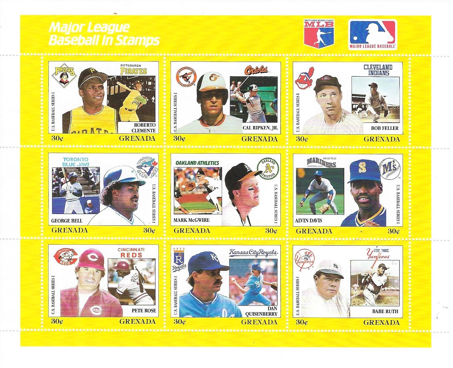 Grenada 30c Block of 9 Major League Baseball Souvenir Stamp Sheet - Yellow