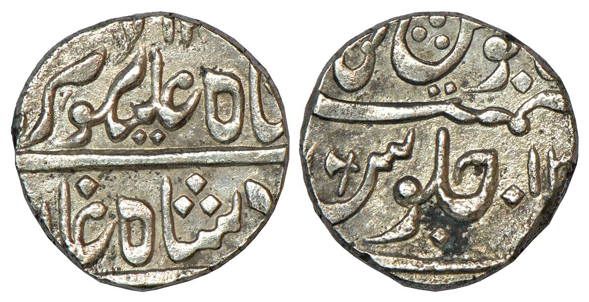Maratha Confederacy, silver rupee, Chinchwad mint (off flan), in the name of Shah Ali Gauhar, RY 13, 'battle-axe' mint mark, M&W T1, 11.18g.
