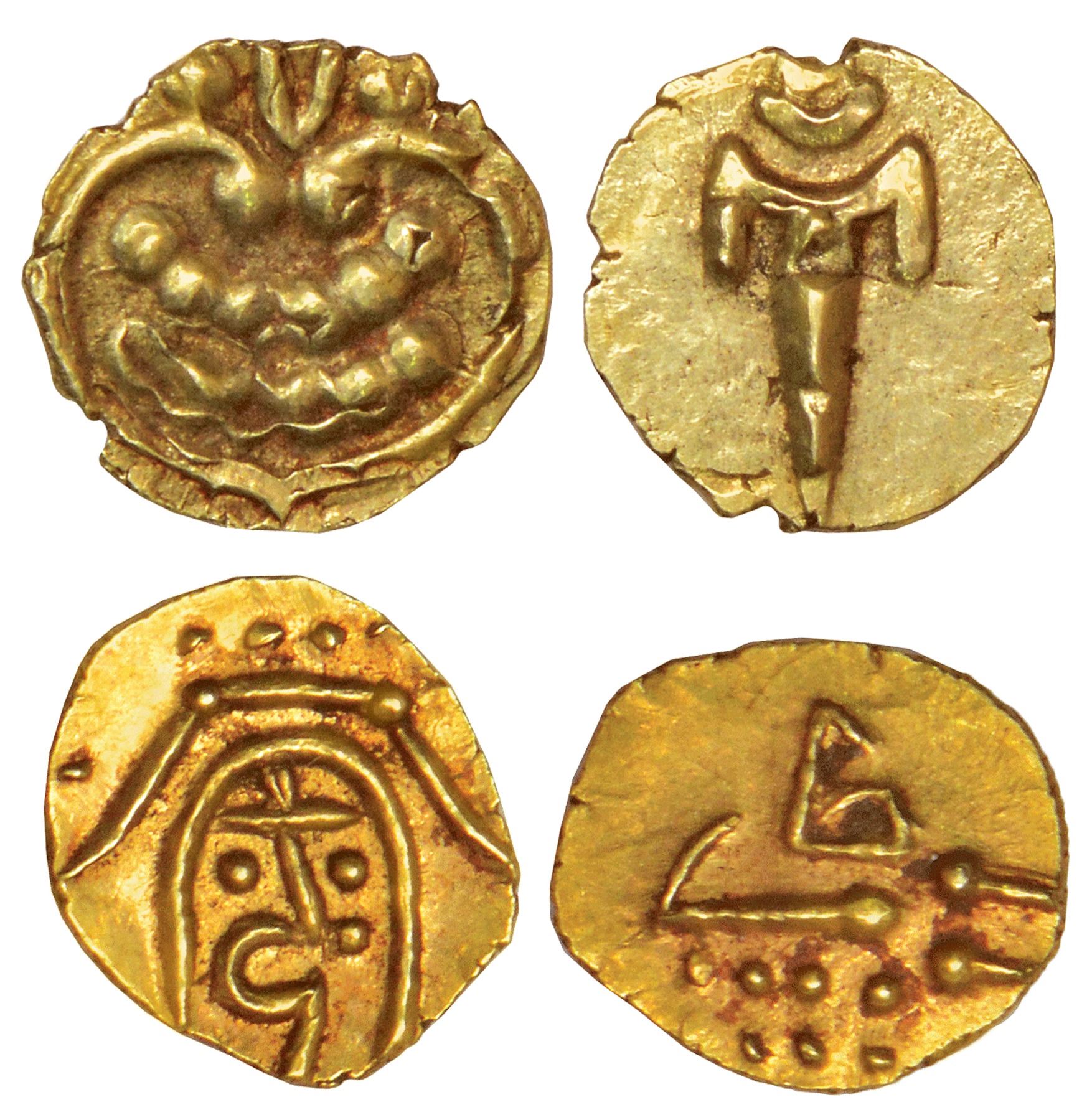 Maratha of Tanjore, Venkoji (1674-1686 AD), gold fanam (2), (a) Obv: Stylized lion with pellets. Rev: Dagger, K. Ganesh Tamil Nadu no 10.1, 0.38g. (b) Obv: Kali design with letter 've'. Rev: Stylized lezy 'J' symbol, dots, M&W T1, 0.39g.