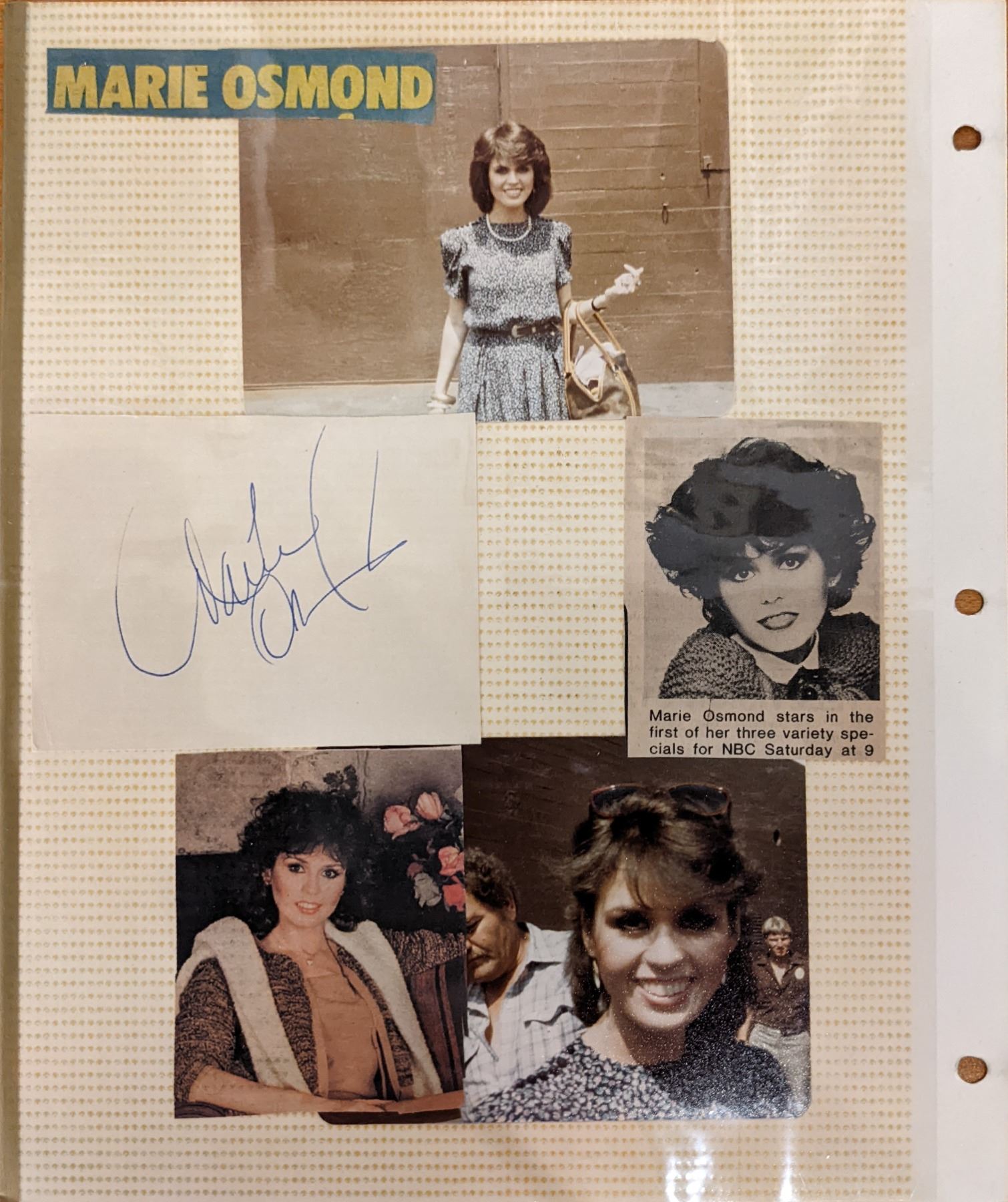Marie Osmond Original Photo Album Page and Signature Cut. From backstage at the Merv Griffin Show. 1980's. 9x11 inches All of these pictures were taken backstage and are one of a kind photos with no copies made