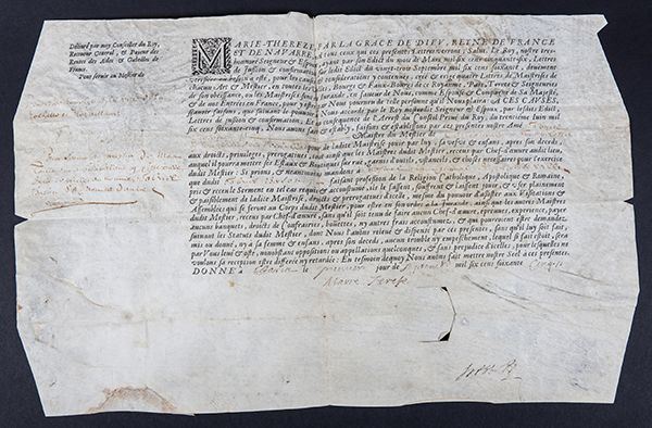Marie Thrse, Queen Consort of Louis Xiv (1638-1683) Daughter of Philip IV of Spain and Elizabeth of France, she and Louis were first cousins; they married in 1660 and had six children, only one of whom (Louis, the dauphin) survived. Document signed as Queen of France and of Navarre, vellum, 17 x 10�, Paris, 1 Sept. 1665. Making use of the powers confided to her by the King "Our much honored Lord and Husband," she confirms Gabriel Moudon (?) in his rights and authorizes him to exercise the profession of tool maker.